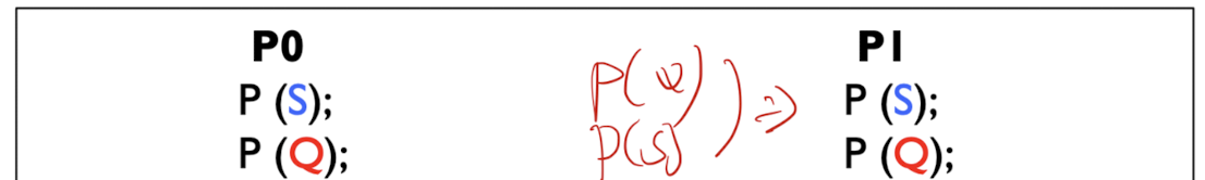 - 두 개의 세마포어 S와 Q가 있고, 초기값은 1입니다.
