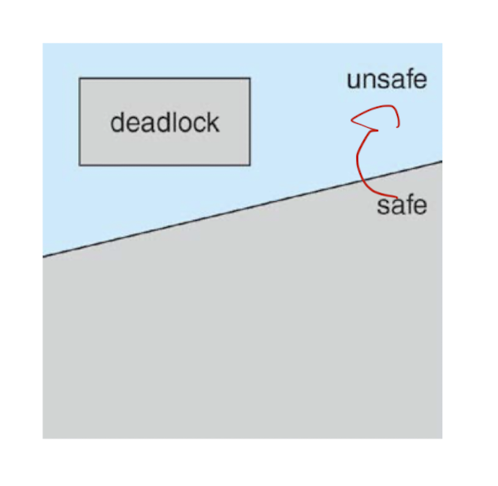 - 시스템이 비안전 상태(unsafe state)에 있으면 Deadlock이 발생할 가능성이 있습니다.