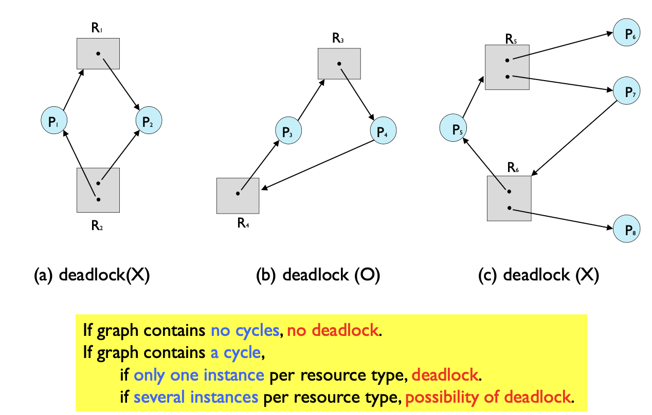 - 그래프에 사이클이 없으면 Deadlock 없음.