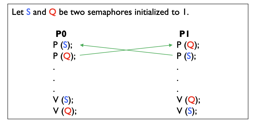 Deadlock : 한 집합의 차단된 프로세스들이 각자 하나의 자원을 잡고 있으며, 동시에 다른 프로세스가 가지고 있는 자원을 얻기 위해 기다리고 있는 상태.