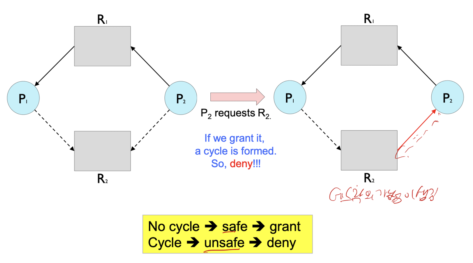 R2에 대한 P2의 request를 grant 하면 사이클이 형성되어 데드락의 발생 가능성이 생기는 것