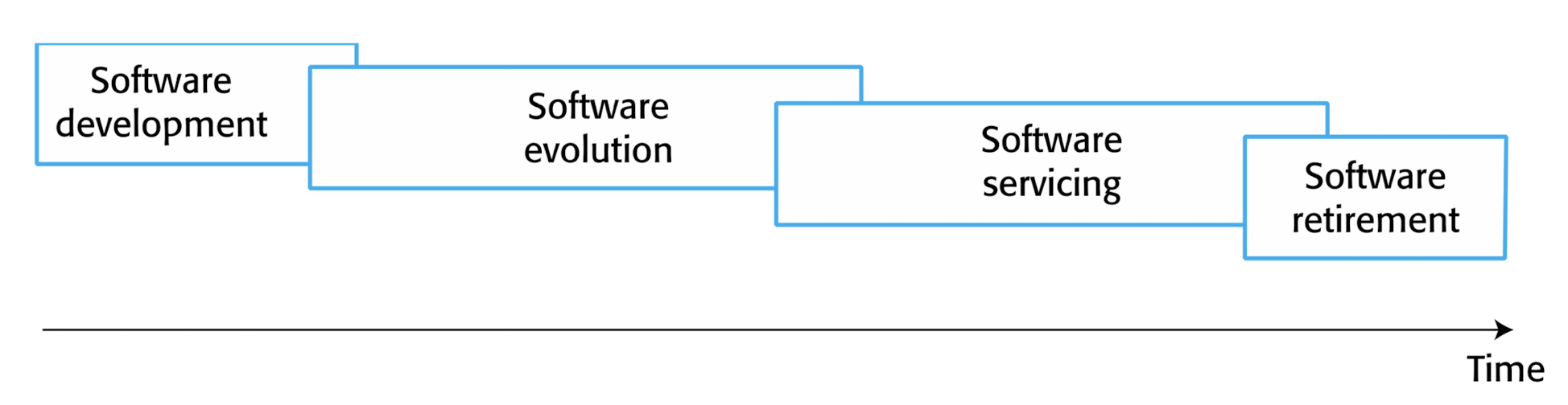 - 시간에 따른 소프트웨어의 단계: 개발(development), 진화(evolution), 서비스(servicing), 퇴출(retirement).