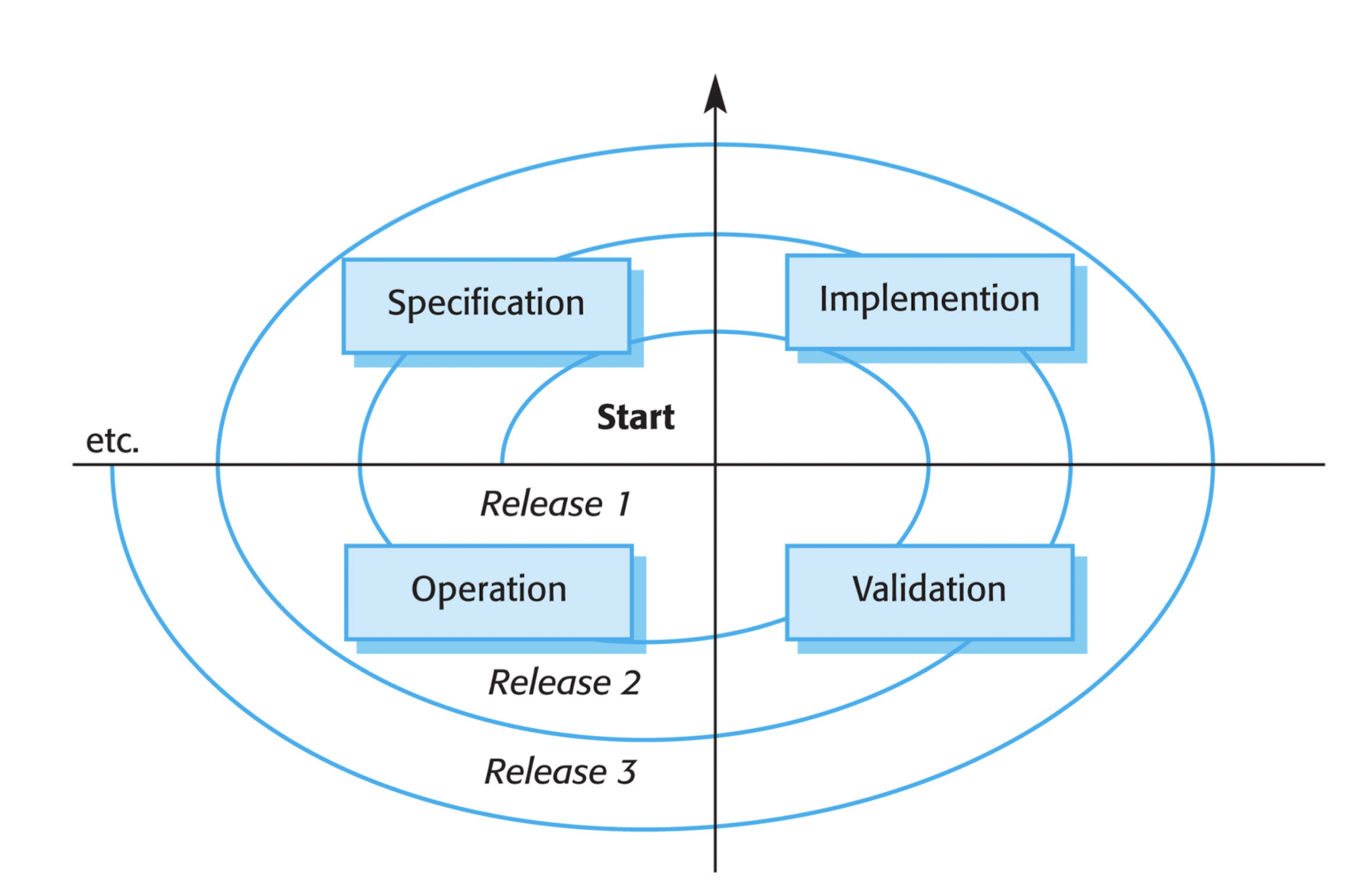- 나선형 모델에서는 명세(specification), 구현(implementation), 운영(operation), 검증(validation) 단계가 반복됩니다.