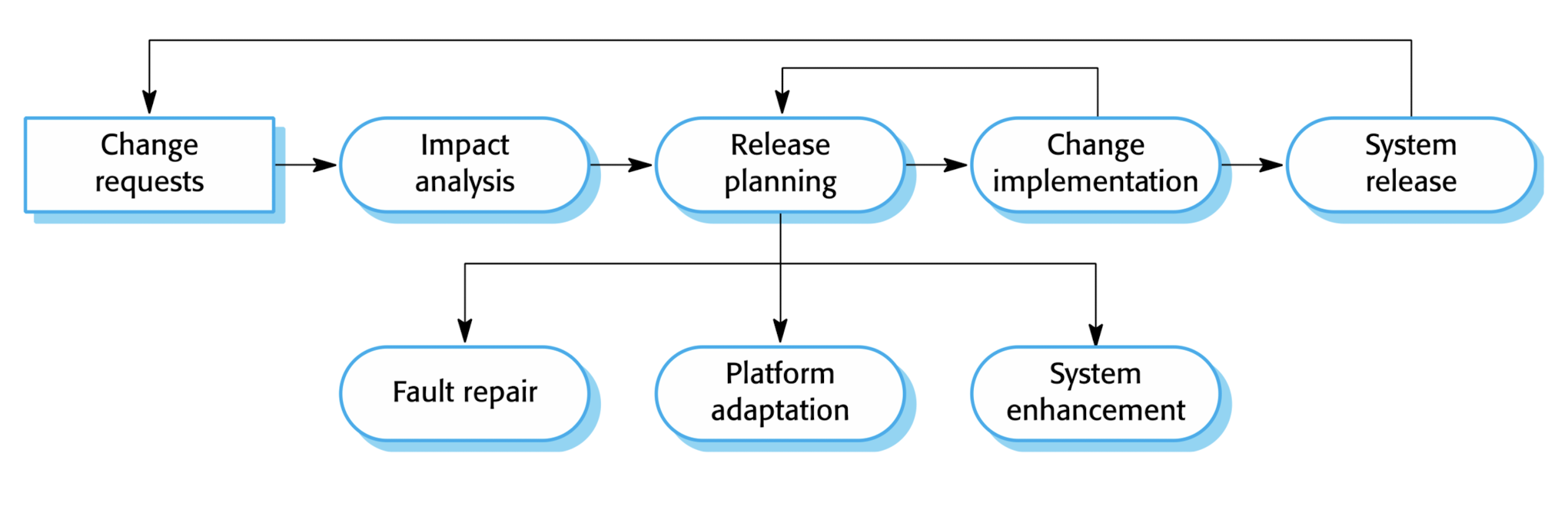 - 변경 요청(change requests)에서부터 영향 분석(impact analysis), 출시 계획(release planning), 변경 구현(change implementation), 시스템 출시(system release)로 이어지는 과정입니다.