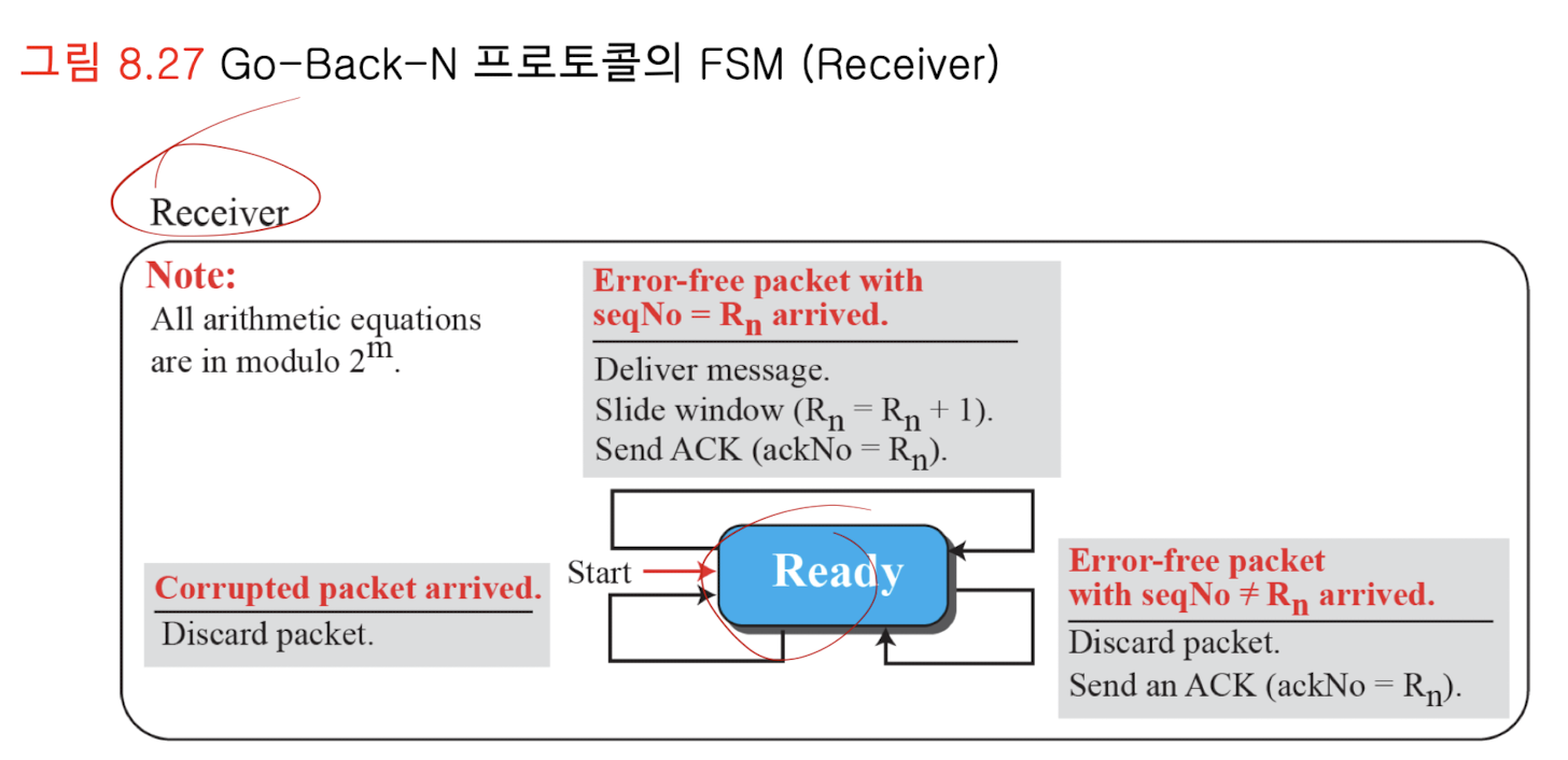 - Go-Back-N 프로토콜은 수신측의 과정을 간단화한다. 수신측은 하나의 변수값만 유지하면 된다.