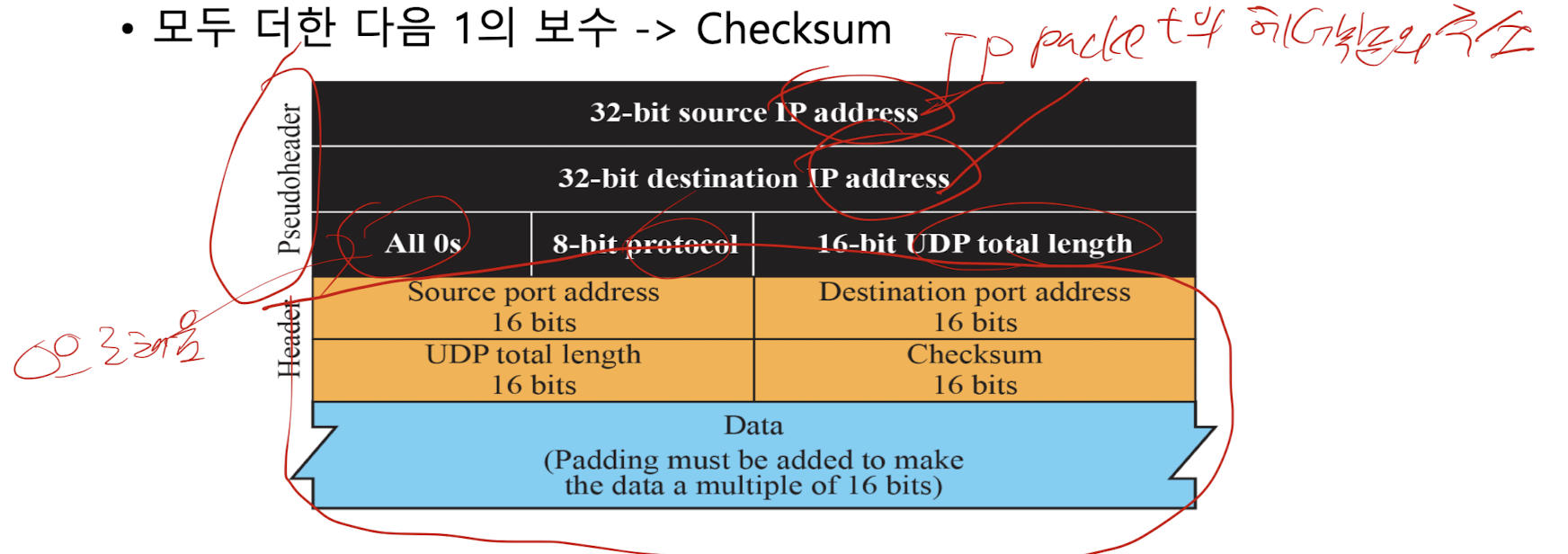 - 3 부분 : Pseudoholder+UDPheader+UDPdata