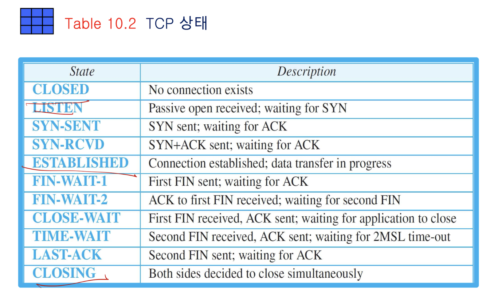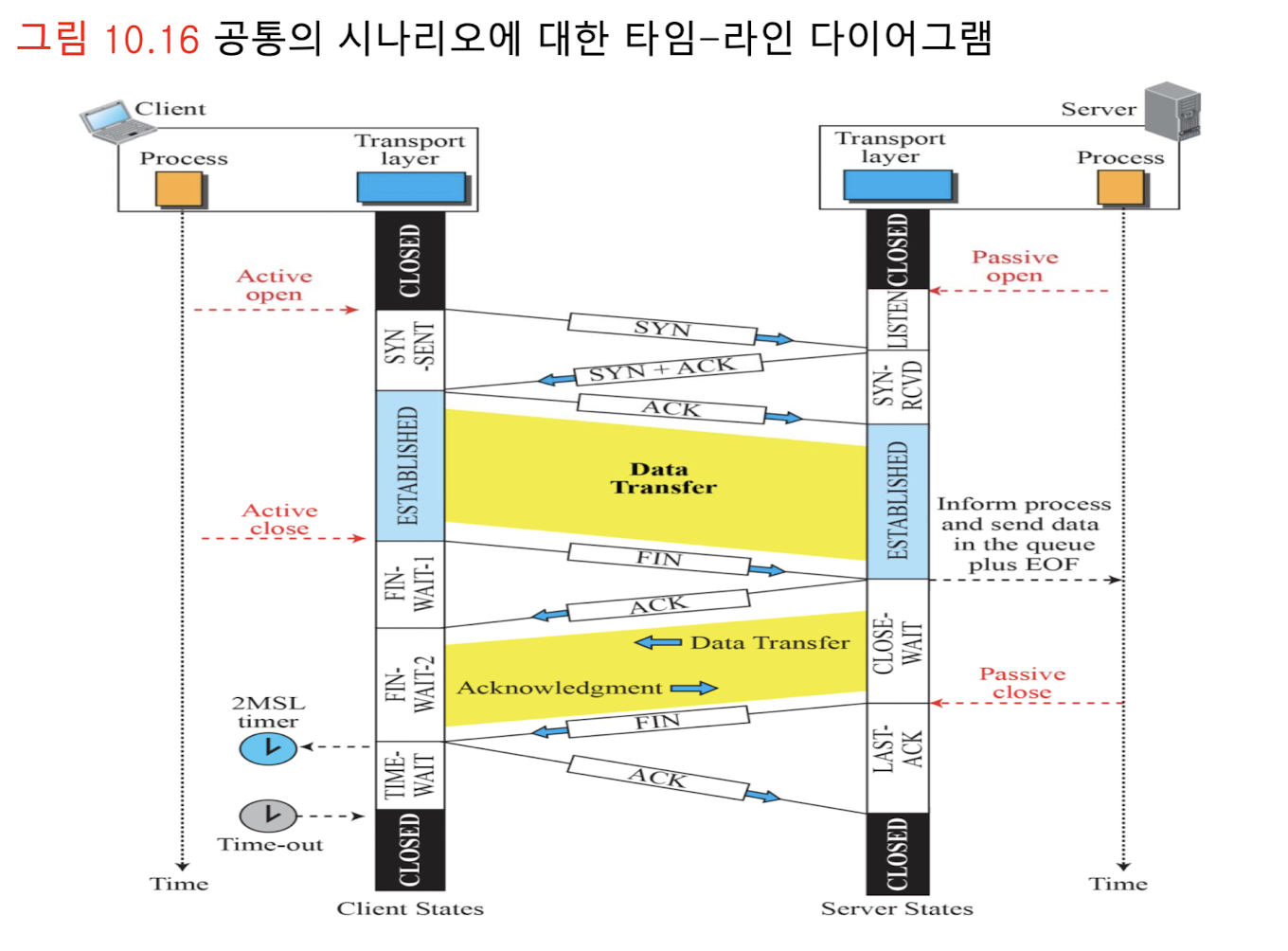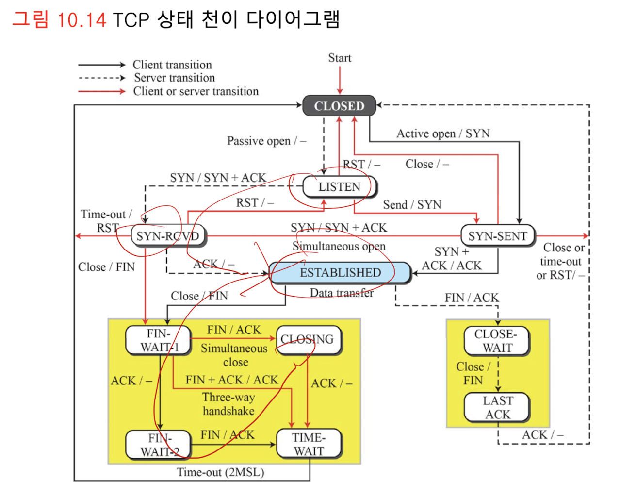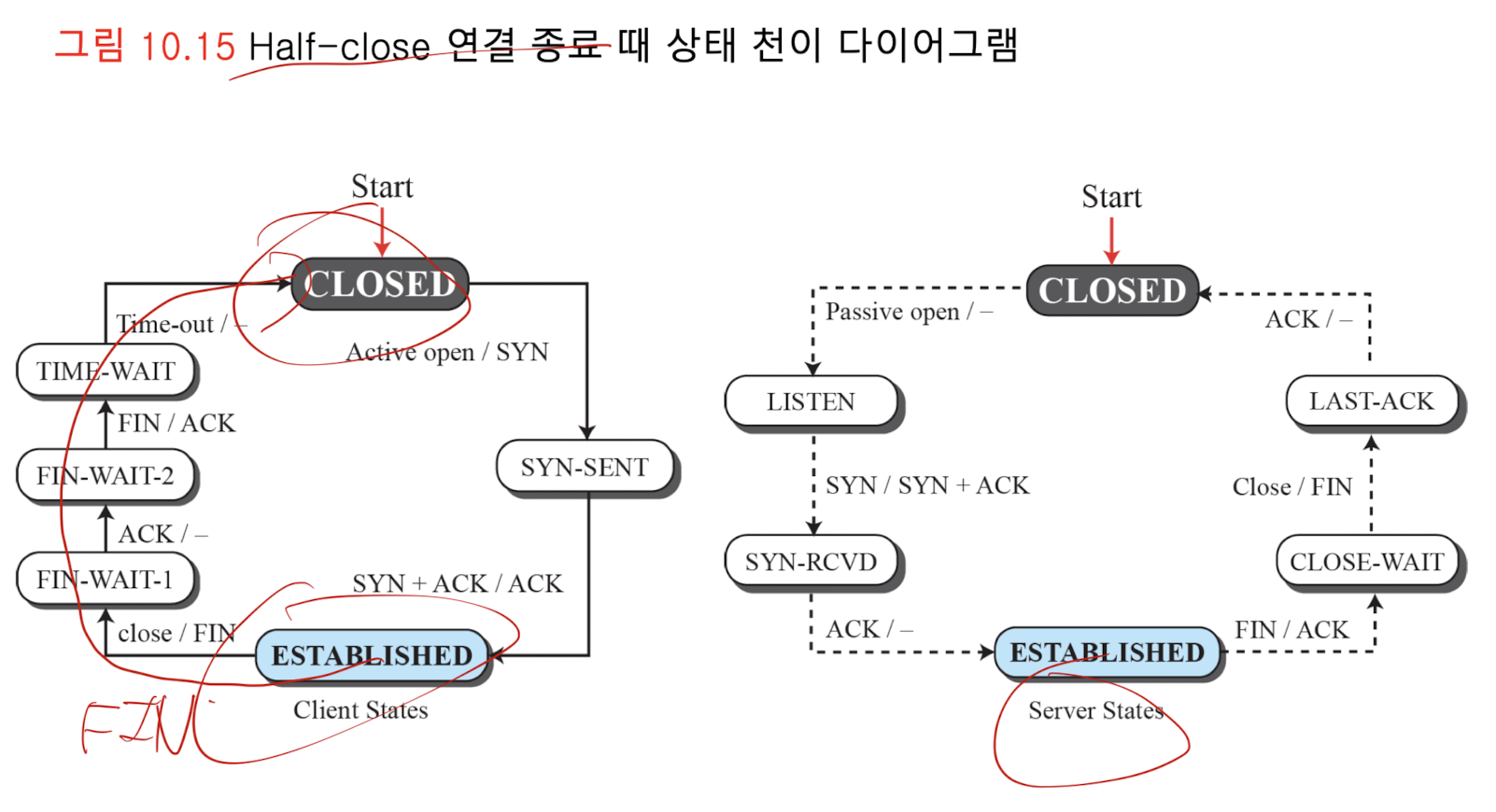 - 연결 설정, 데이터 전송, 연결 해제 간에 발생하는 모든 이벤트를 추적하기 위해, TCP는 유한기계상태(finite state machine, FSM)을 정의하여 사용