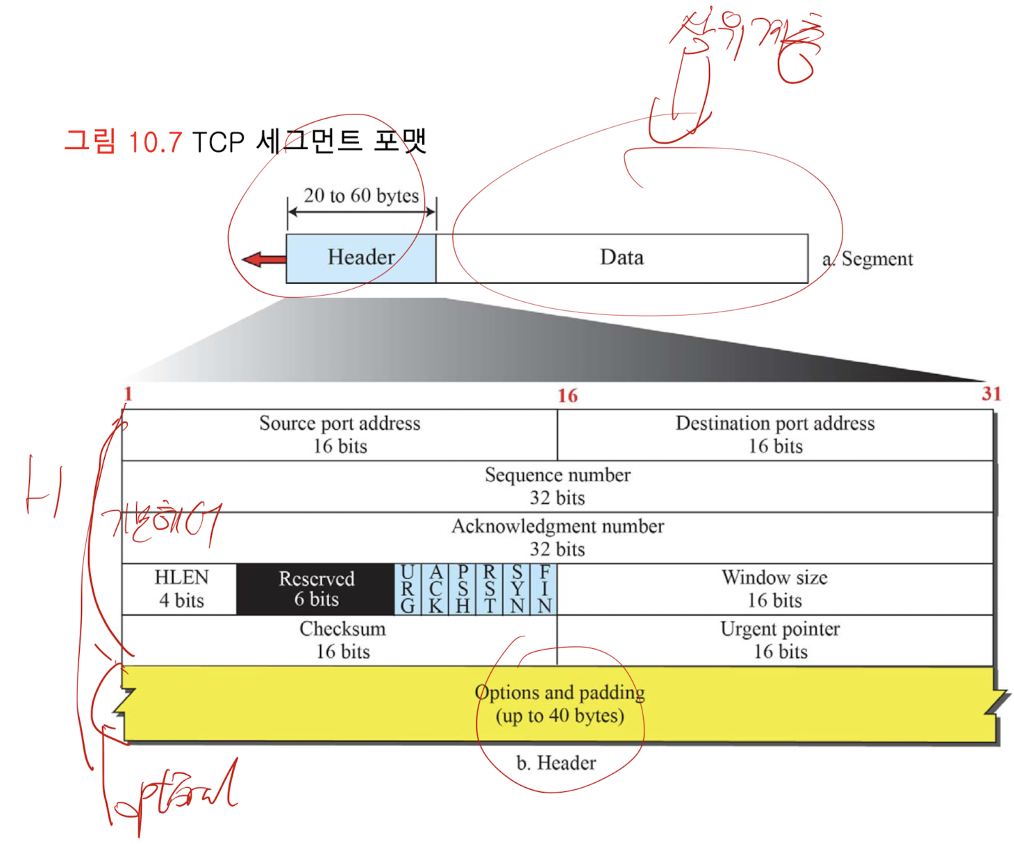 - Urgent Pointer(16bits) : 세그먼트내 데이터내의 마지막 긴급데이터 오프셋값