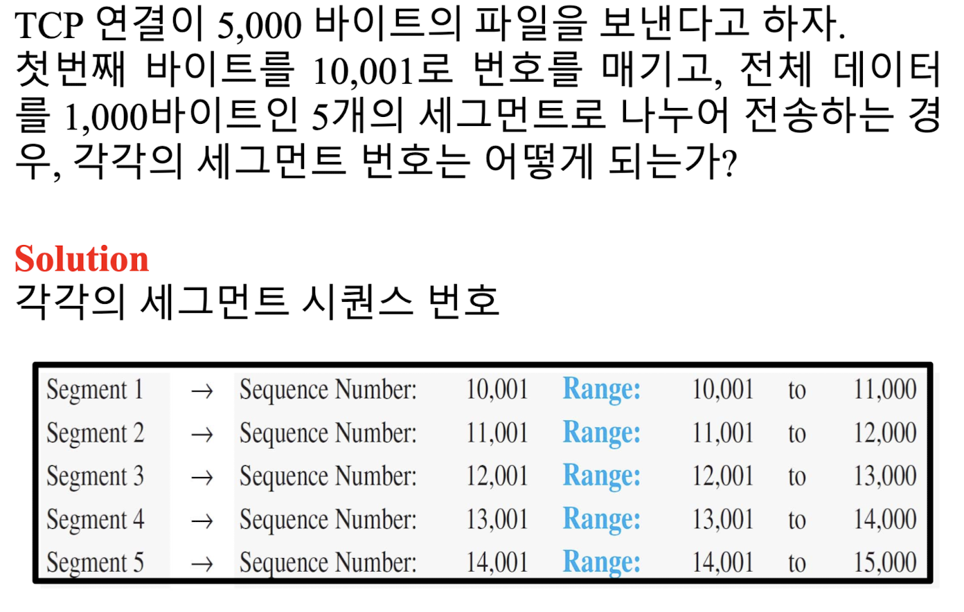 부연설명 하자면, 100MB 중에서 처음 값(랜덤)이 1000번(Byte)이고, 세그먼트 크기가 2000Byte일 때, 두 번째 Sequence number는 3000, 그 다음은 5000....