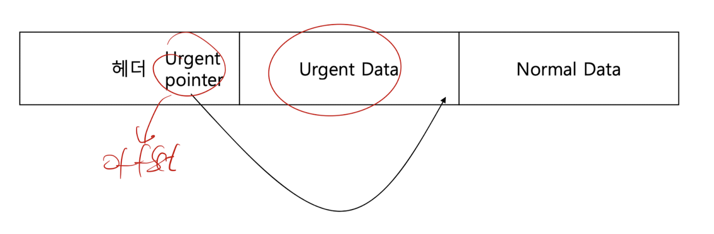 - 헤더내 URG 비트가 1이면, 세그먼트내의 처음부터 urgent pointer 값까지 urgent data이고, 그 이후가 정상적인 데이터임
