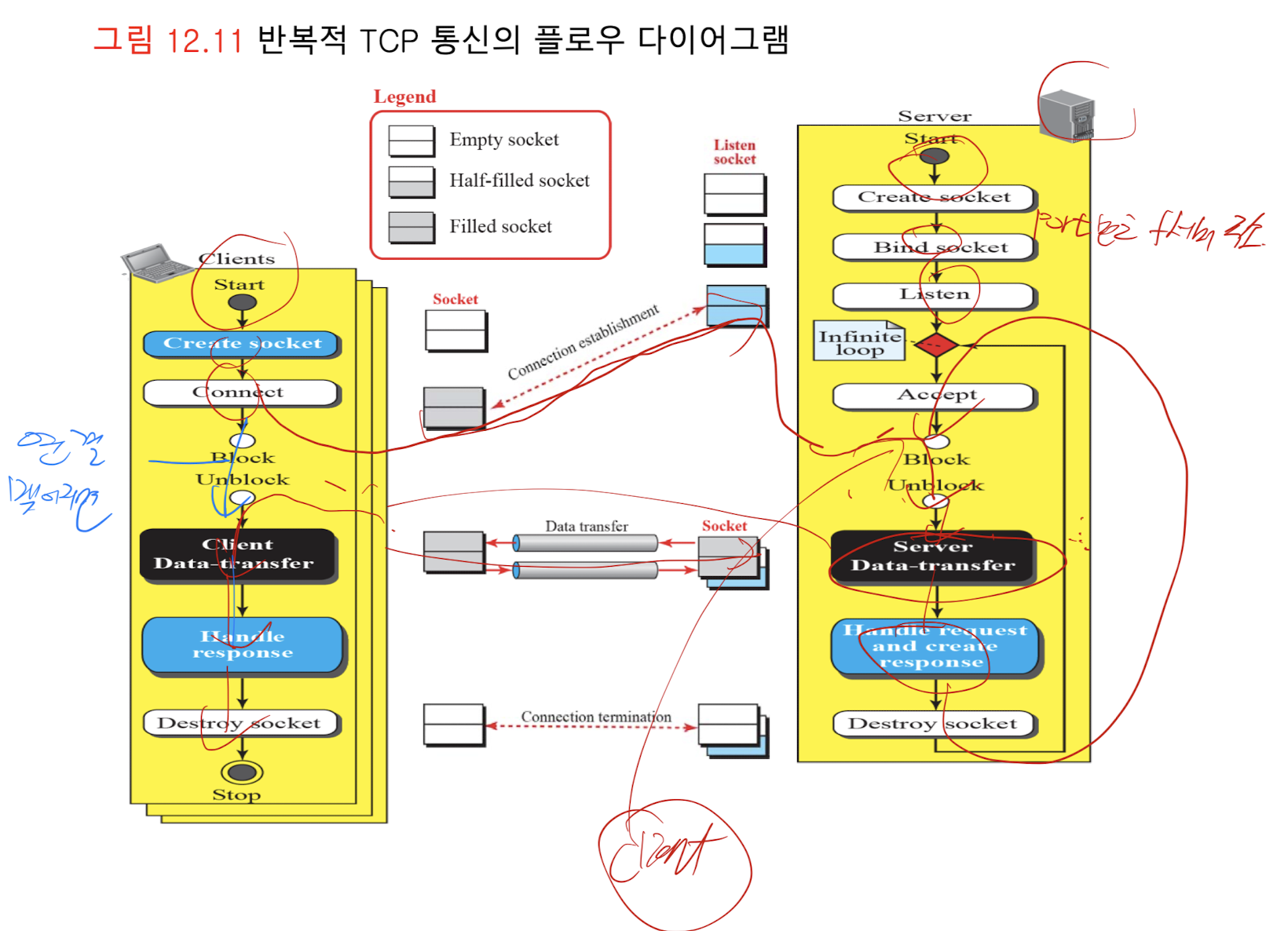 - 반복적 서버는 한번에 하나의 클라이언트 요청 처리