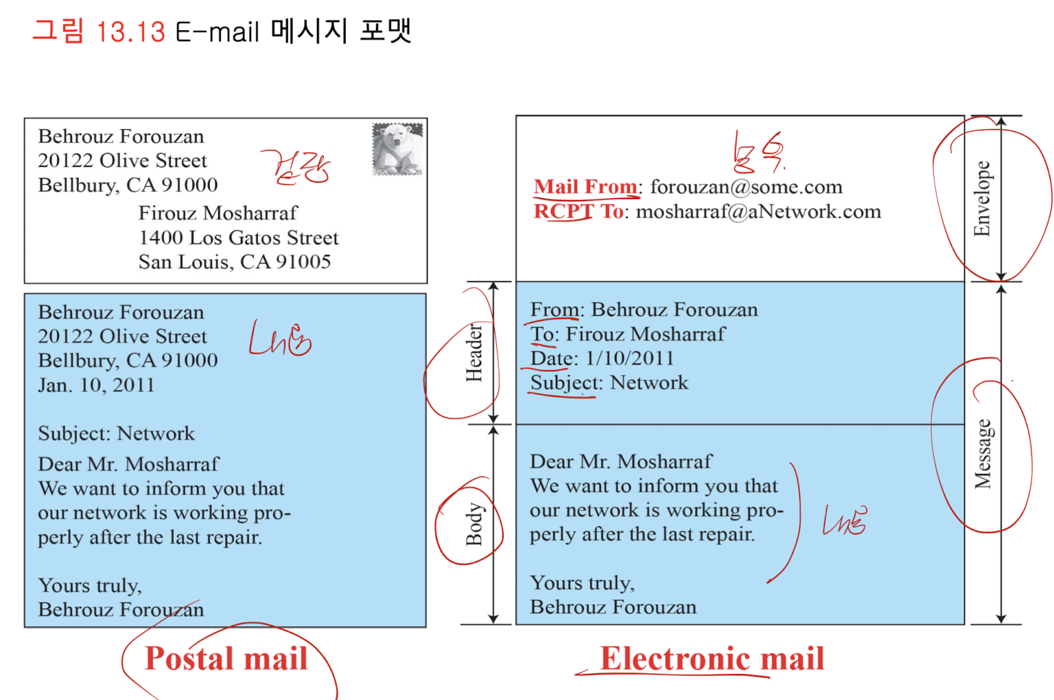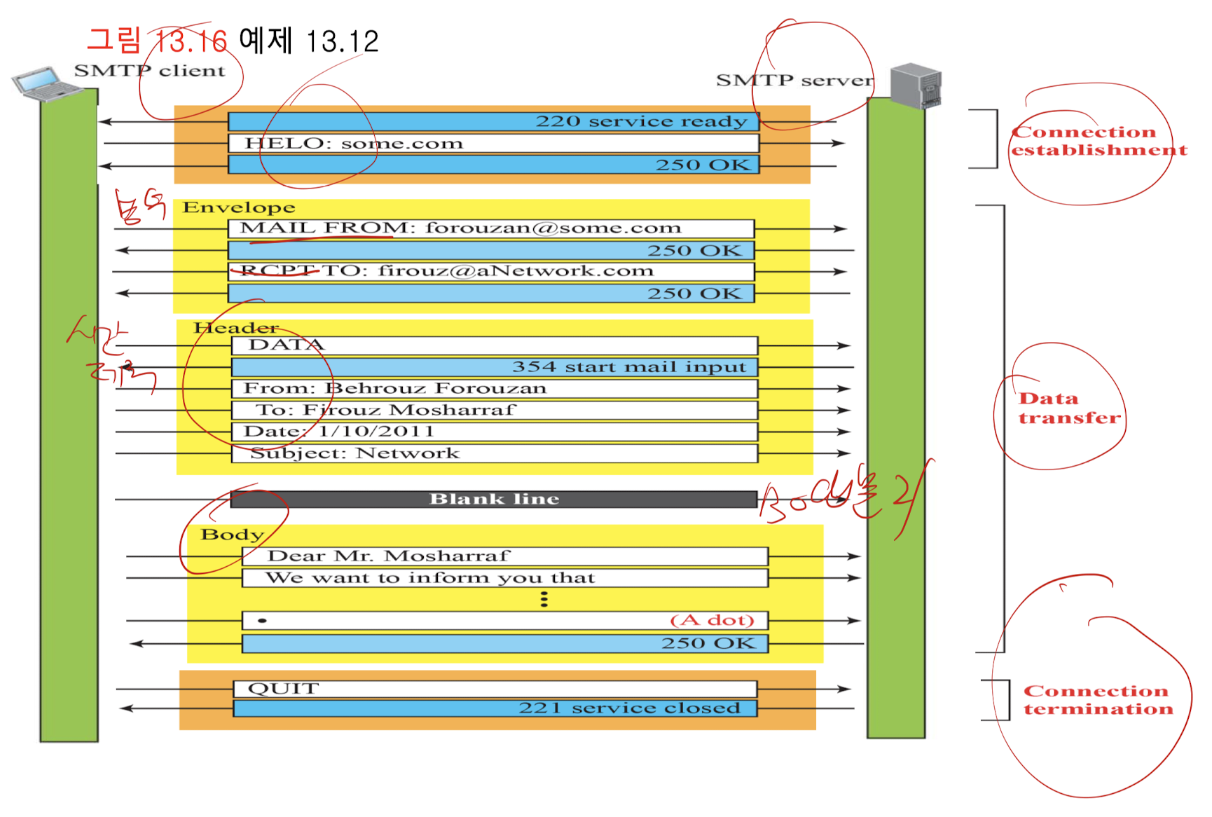 그림에서 데이터 전달 섹션에서 봉투 헤더, 바디 (envelope, header, body)를 나누어 묘사했다 클라이언트는 frouzan@anetwork.com으로 이메일을 보내기 위해 자신의 로컬 메일 서버인 someone.com에 접속 하여 이메일을 서버로 올리는 단계이다. 로컬 메일서버는 이메일 메시지를 다 받은 이후에 spool에 넣고, 이 후에 리모트의 상대 이메일 서버로 보낼 것 이다.
