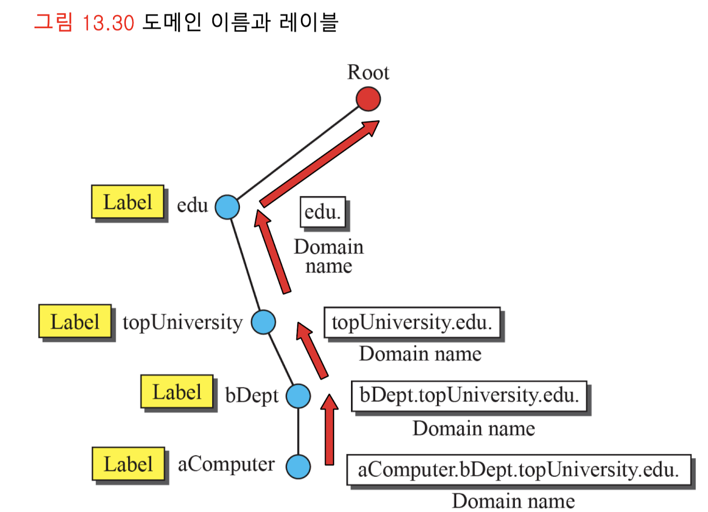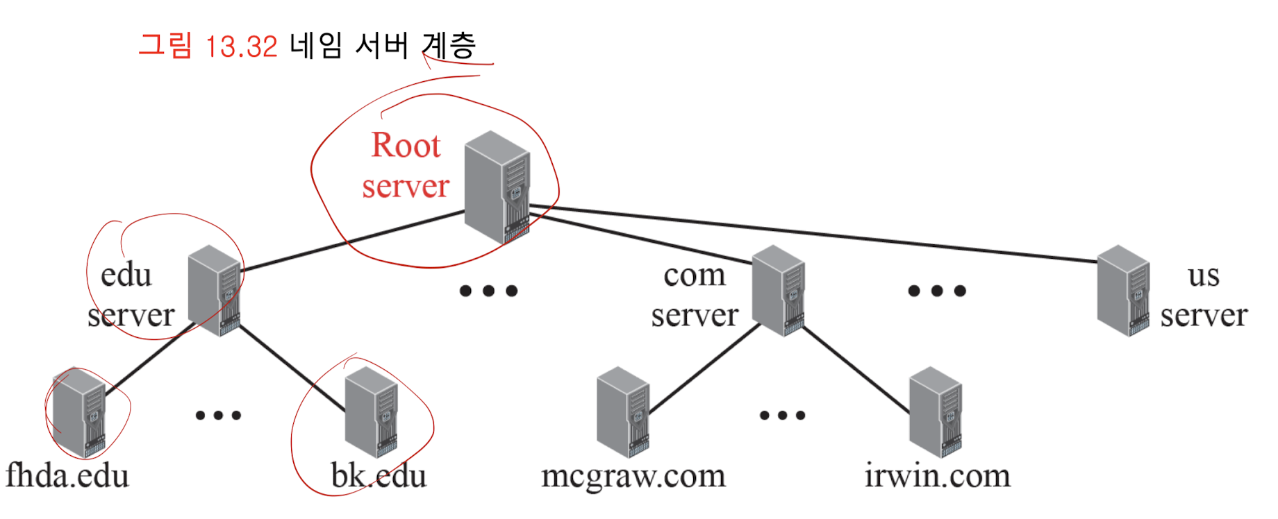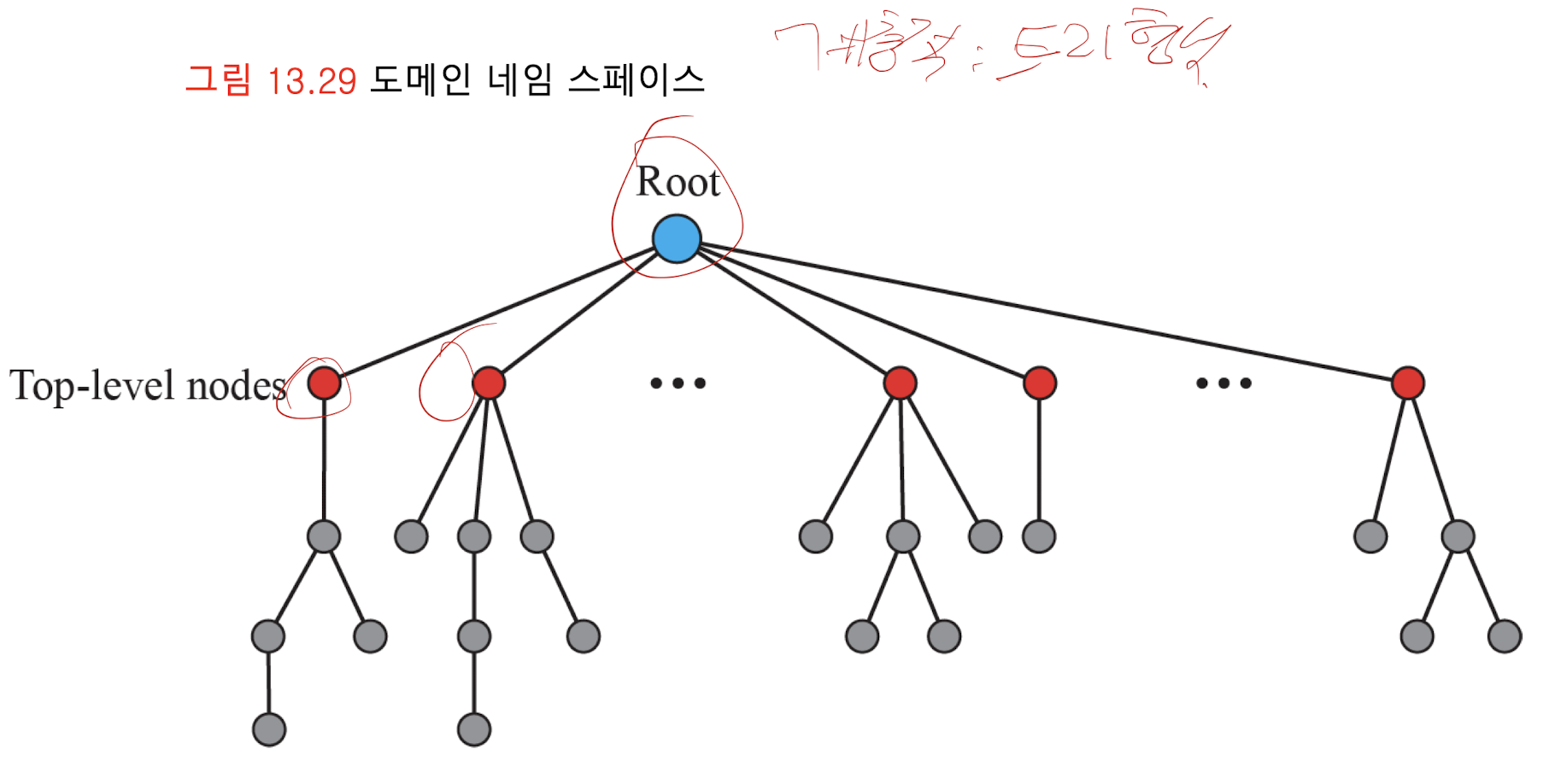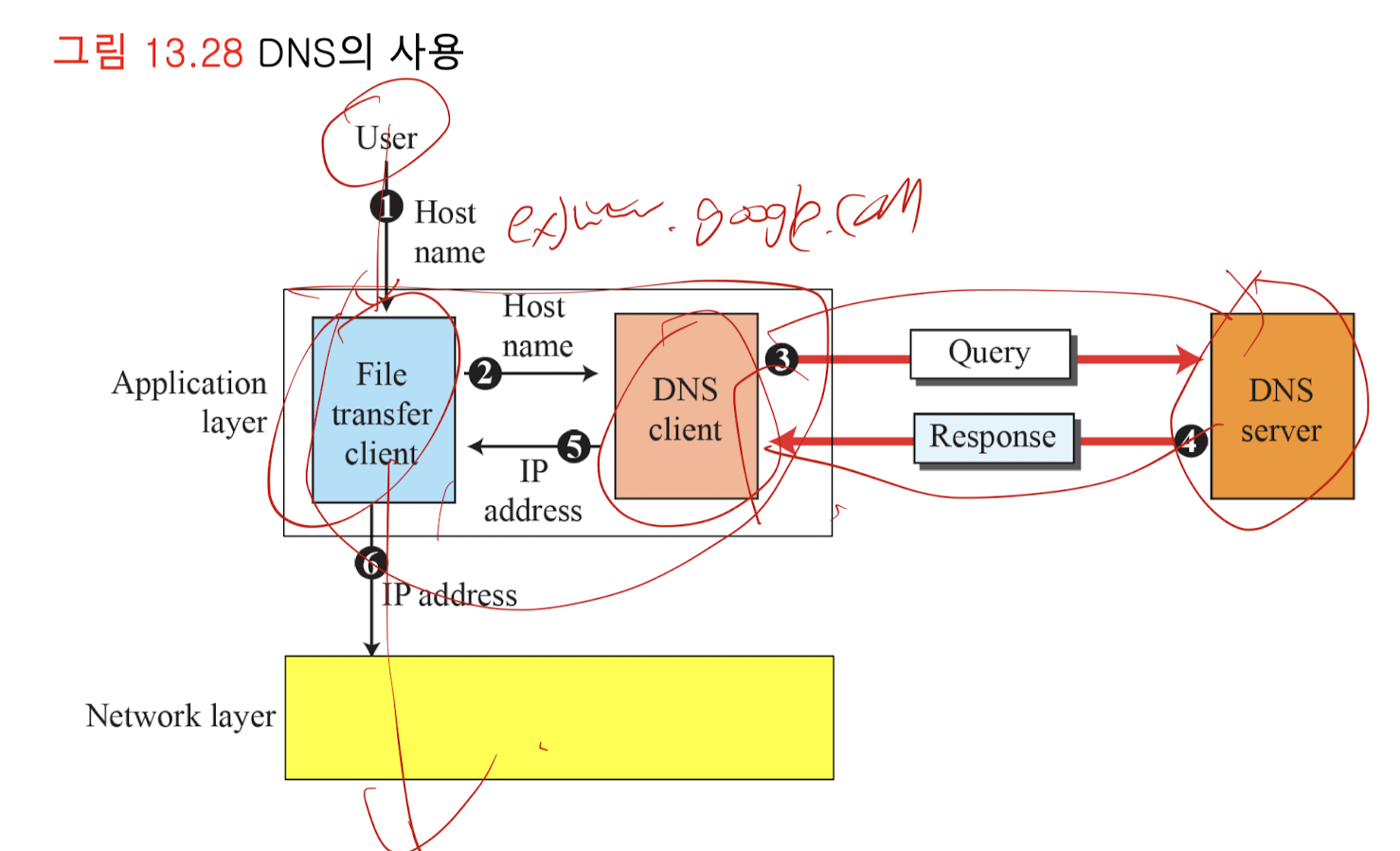 - 그림 13.28은 어떻게 TCP/IP의 응용 프로그램에서 이름에서 주 소를 매핑하기 위해 DNS 클라이언트와 DNS 서버를 활용하는 방식을 보여줌