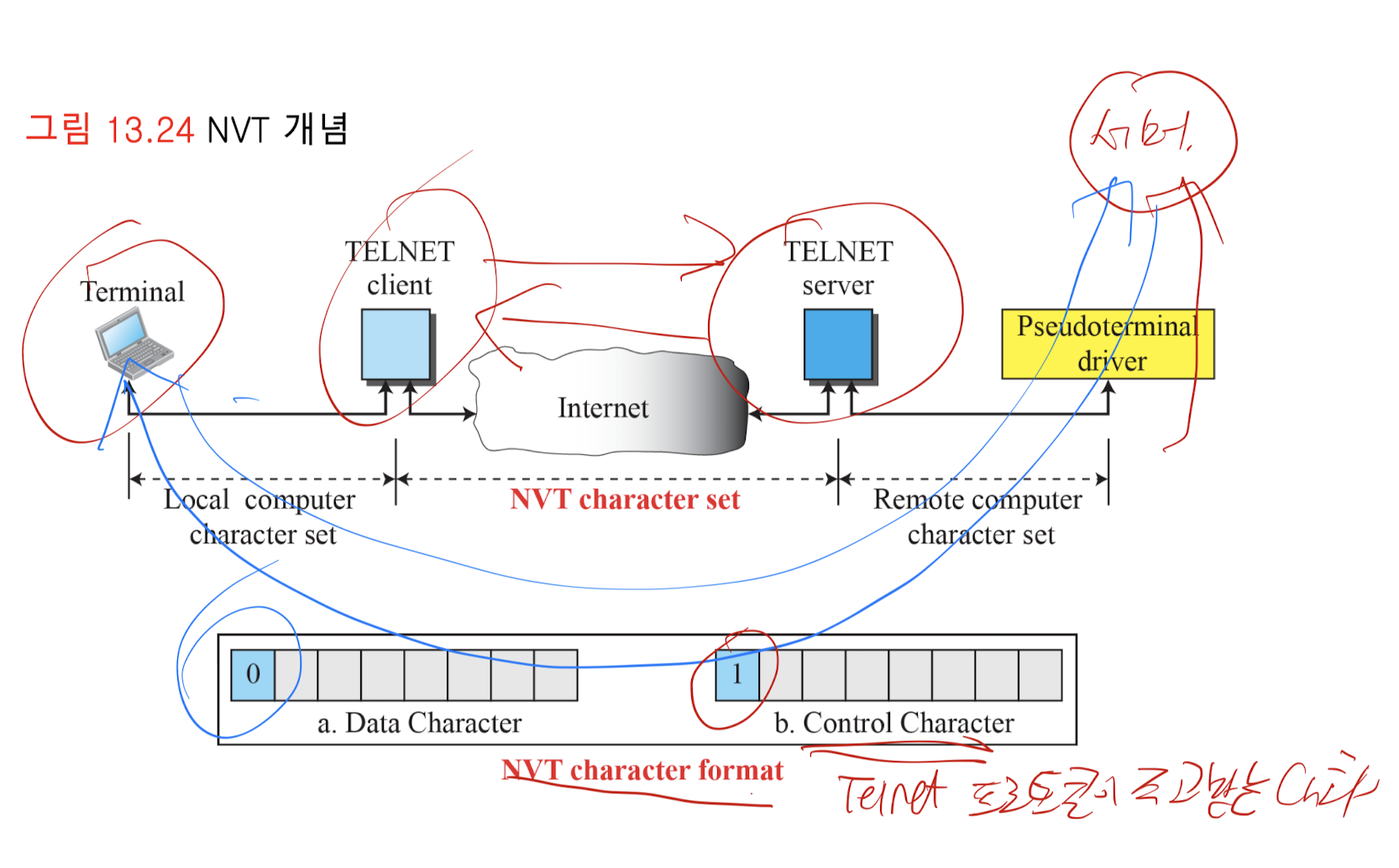 참고) NVT (Network Virtual Terminal)는 TELNET 프로토콜에서 사용하는 가상 터미널의 표준화된 개념입니다. 이를 통해 서로 다른 시스템 간의 통신을 가능하게 합니다.