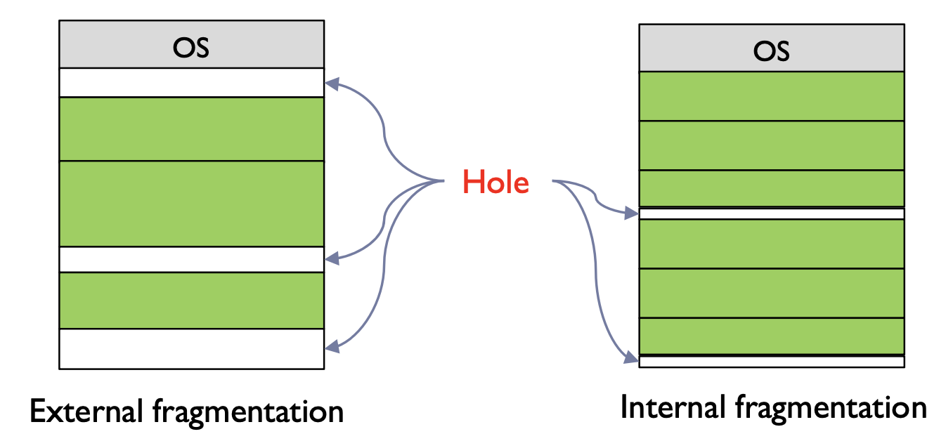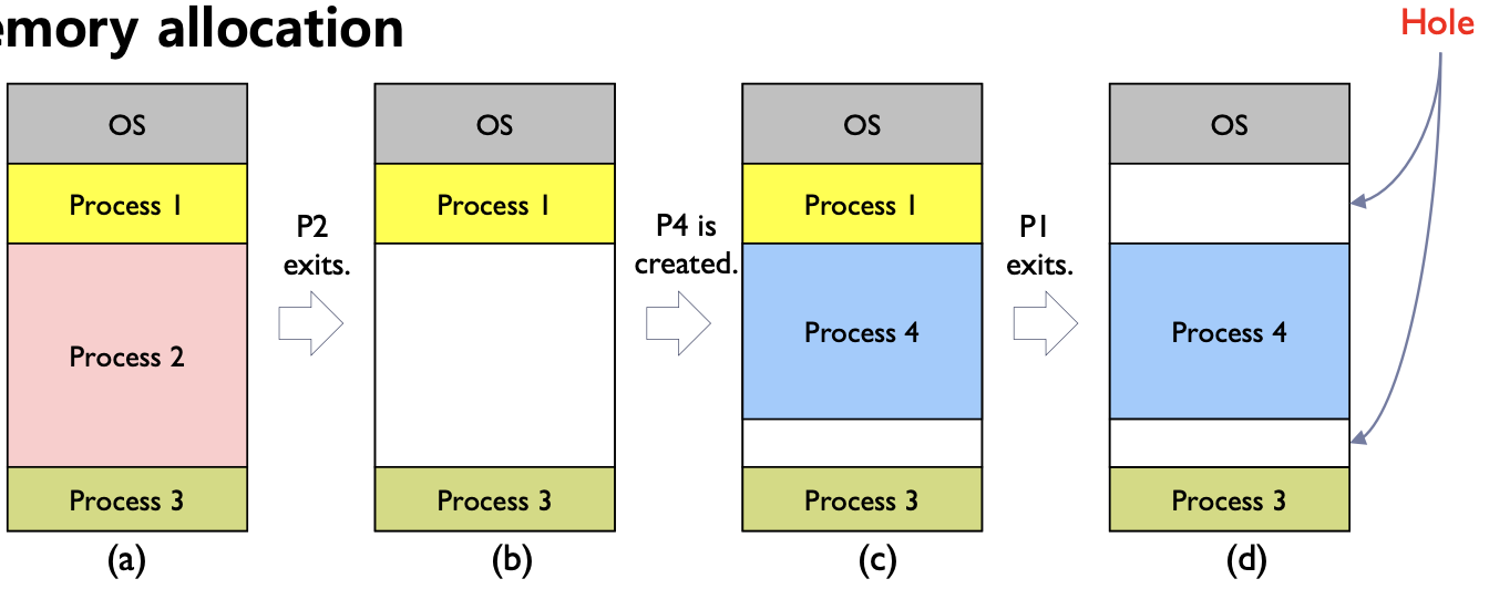 즉, 프로세스의 생성과 종료에 따라 다양한 크기의 홀(hole)이 메모리 곳곳에 생기는데요.