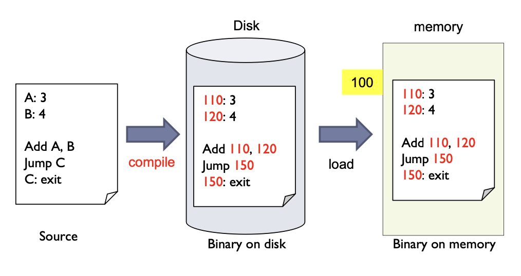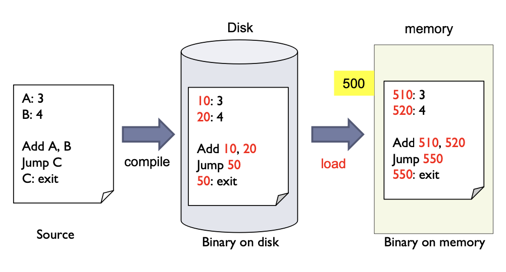 - 만약 시작 주소가 변경된다면(프로그램이 적재되는 메모리 상의 위치가 변경된다면), 반드시 코드 recompile 해야 함
