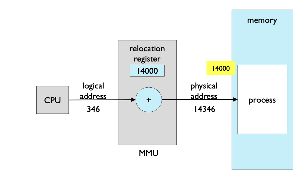 - relocation register(재배치 레지스터)에 있는 값이 CPU에 의해 생성된 모든 주소에 더해짐