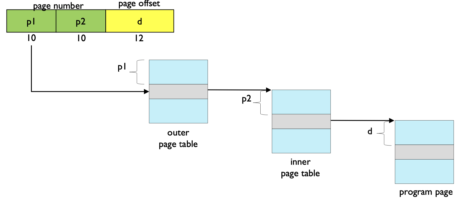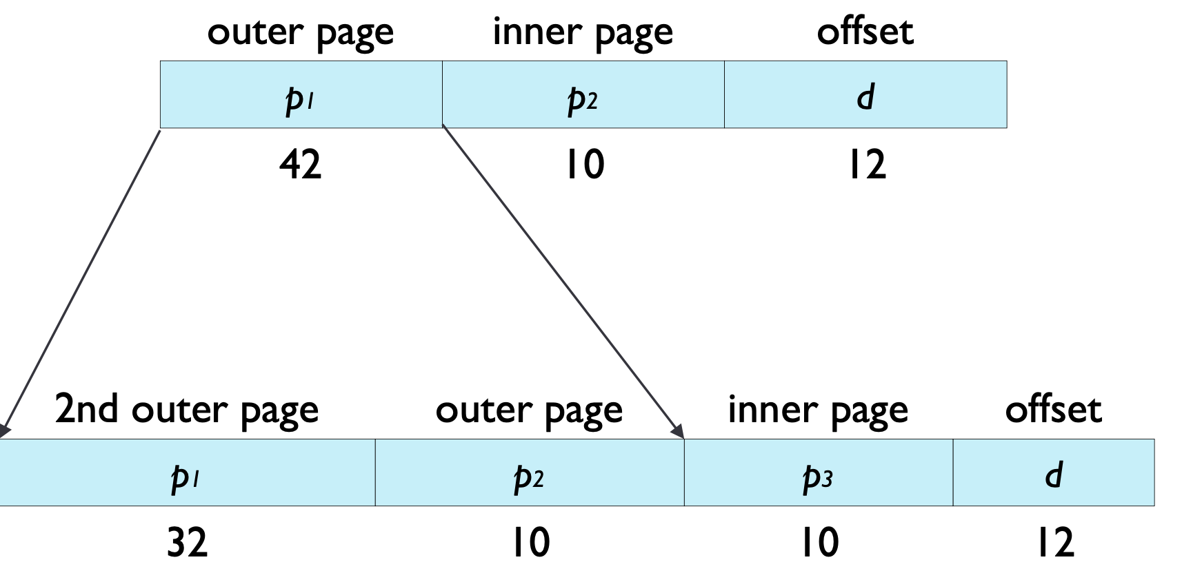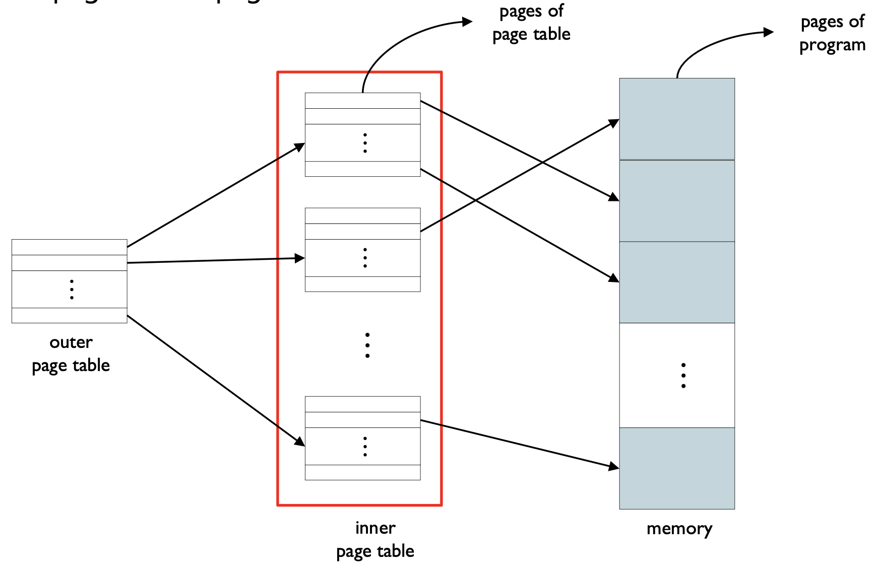 따라서, 페이지 테이블을 구성하는 각 페이지가 디스크 혹은 메모리에 있을 수 있으므로, 이러한 정보를 담고 있는 상위 레벨의 페이지 테이블이 하나 더 필요합니다.