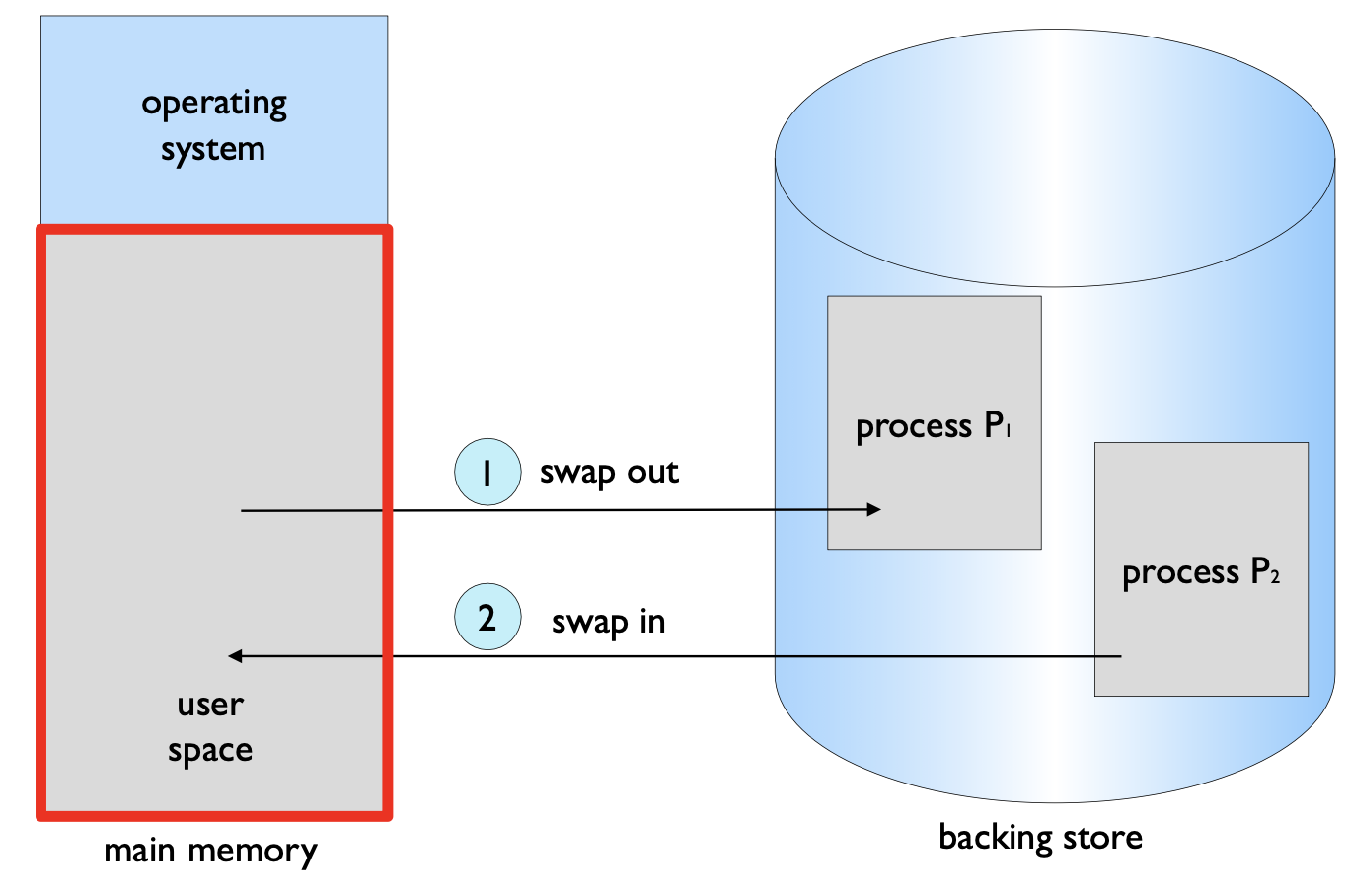 - 프로세스는 일시적으로 메모리에서 백업 저장소로 스왑된 다음, 나중에 메모리로 가져올 수 있다