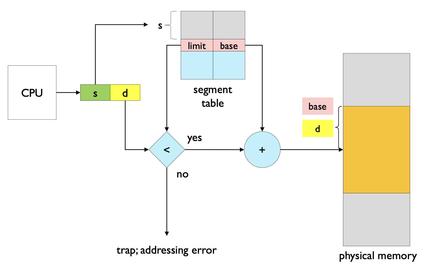 논리주소 중 d로 표시된 하위 비트들은 limit 값을 통해 요청 주소가 해당 세그먼트의 범위를 넘지 않았는지 확인하고, 넘지 않았을 경우에는 base 값에 더해져서 물리주소로 변환됩니다. (위에서 봤던 limit register가 하는 역할과 비슷)