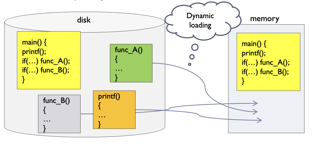 - loader에 의해 메모리에 올라온 프로세스가(실행시간에) dynamically loaded system library에서 불러온다.