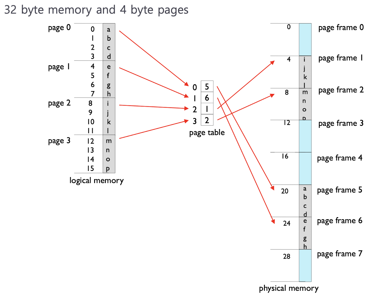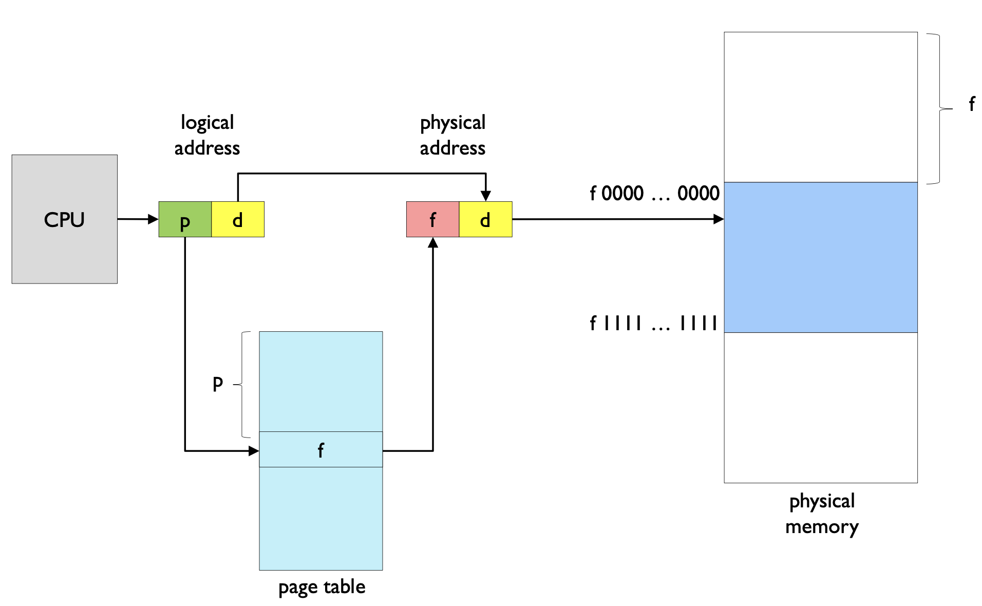 - 물리적 주소(physical address)는 프레임 번호(i)와 변위(d)로 구성됩니다.