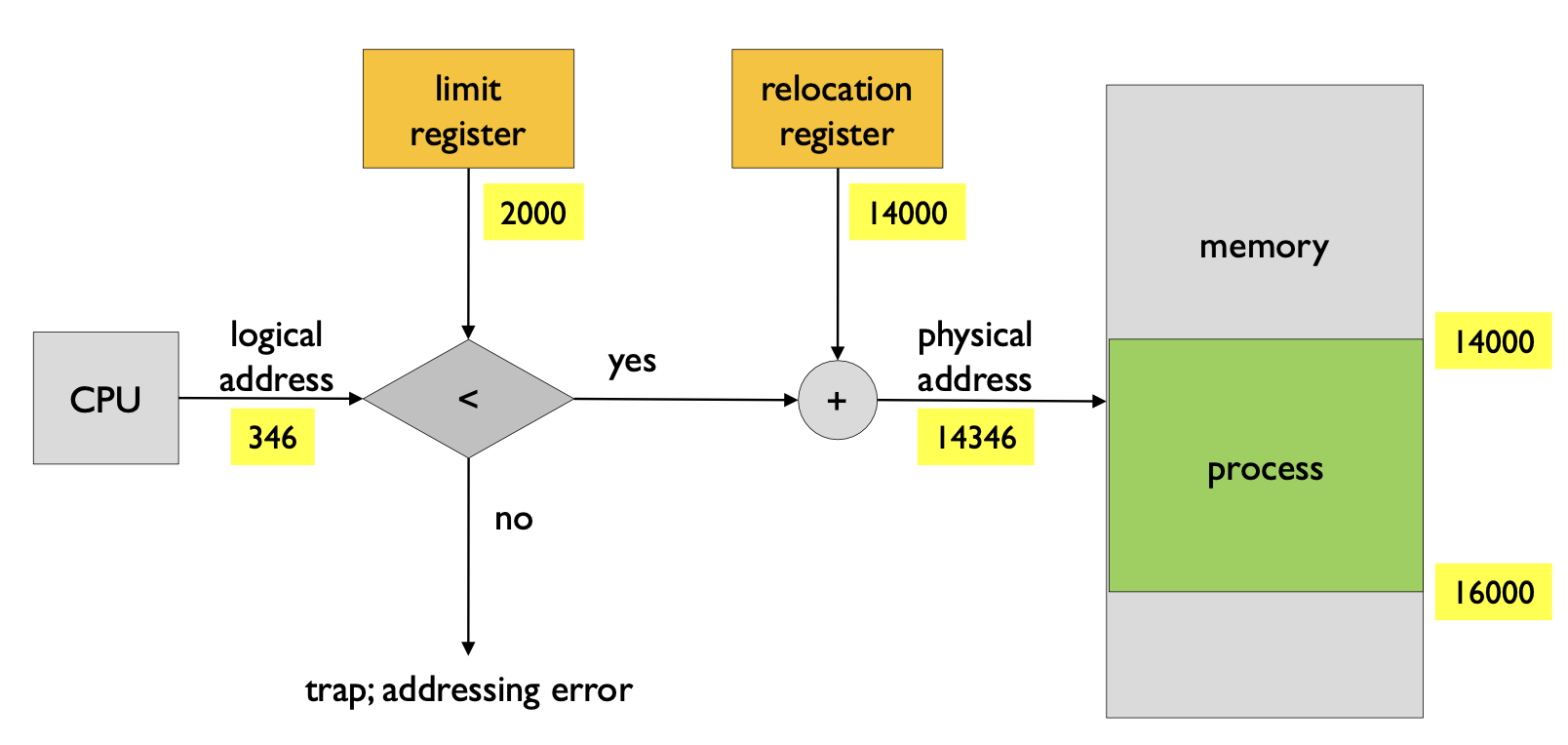 - (Relocation register + logical address) < (Relocation register + limit register : user process 범위)이므로, 파티션을 넘어서 접근하지 못한다