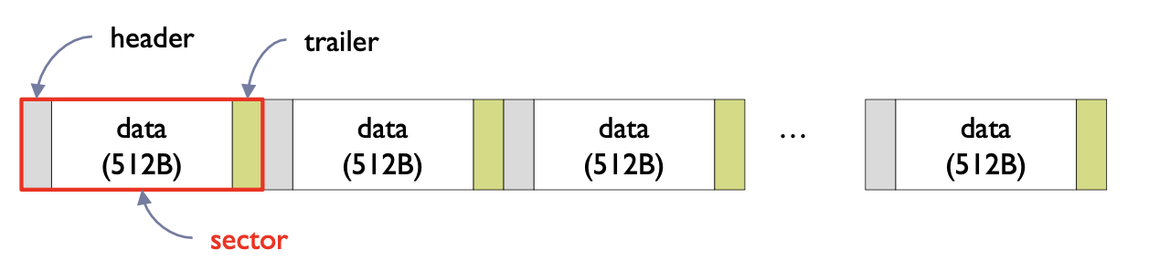 - 섹터(sector): 트랙을 나눈 작은 저장 단위