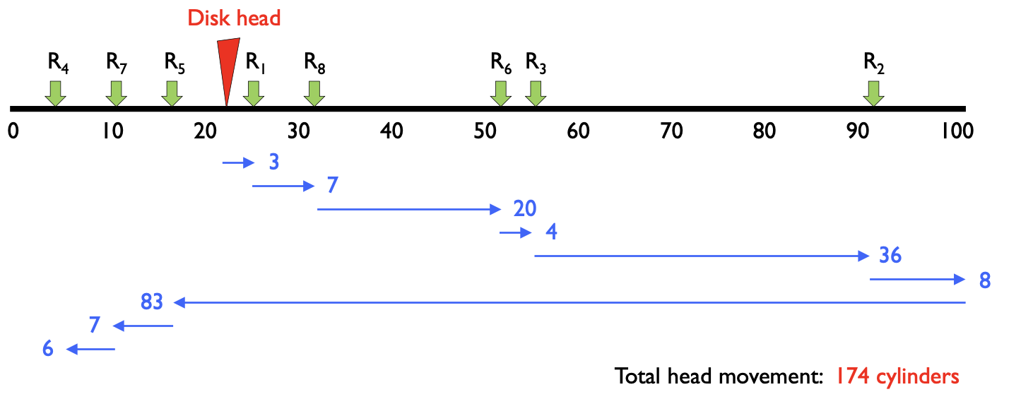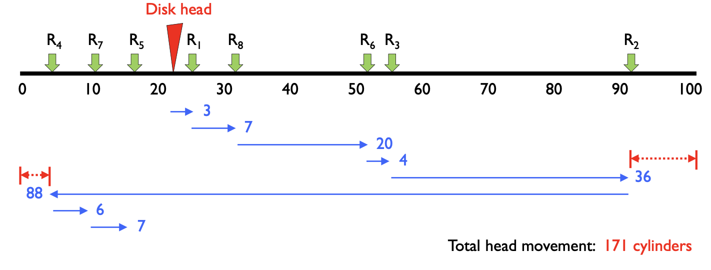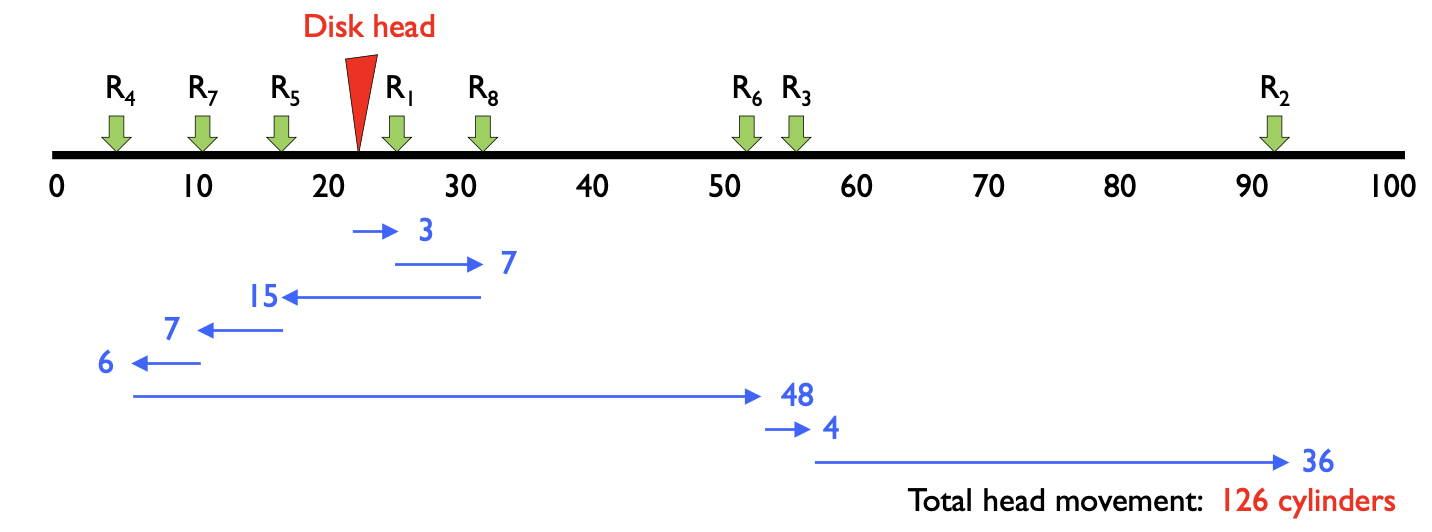 - 현재 헤드 위치에서 최소 탐색 시간으로 요청 처리