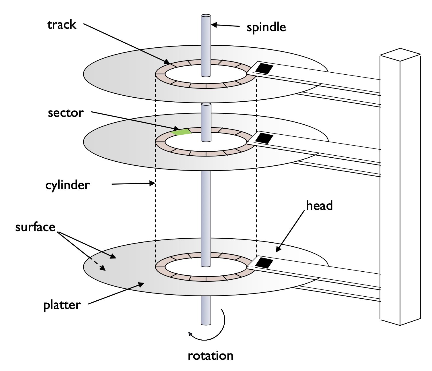 - 회전 지연(Rotational delay): 원하는 섹터가 디스크 헤드 아래에 올 때까지의 회전 시간(수평 이동)