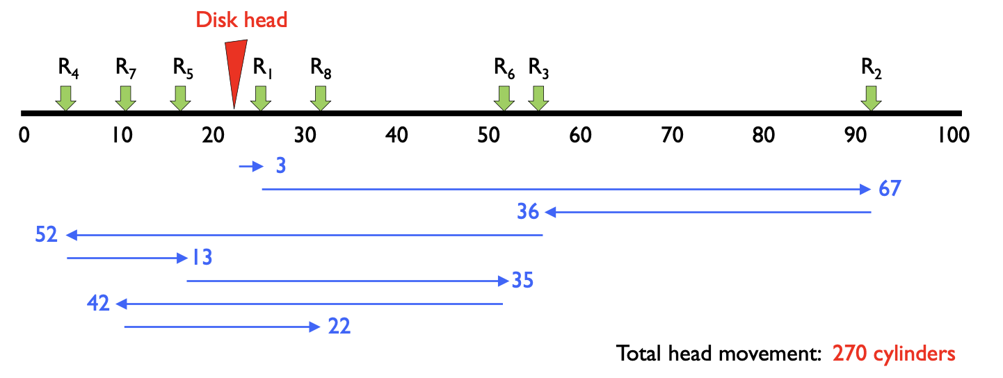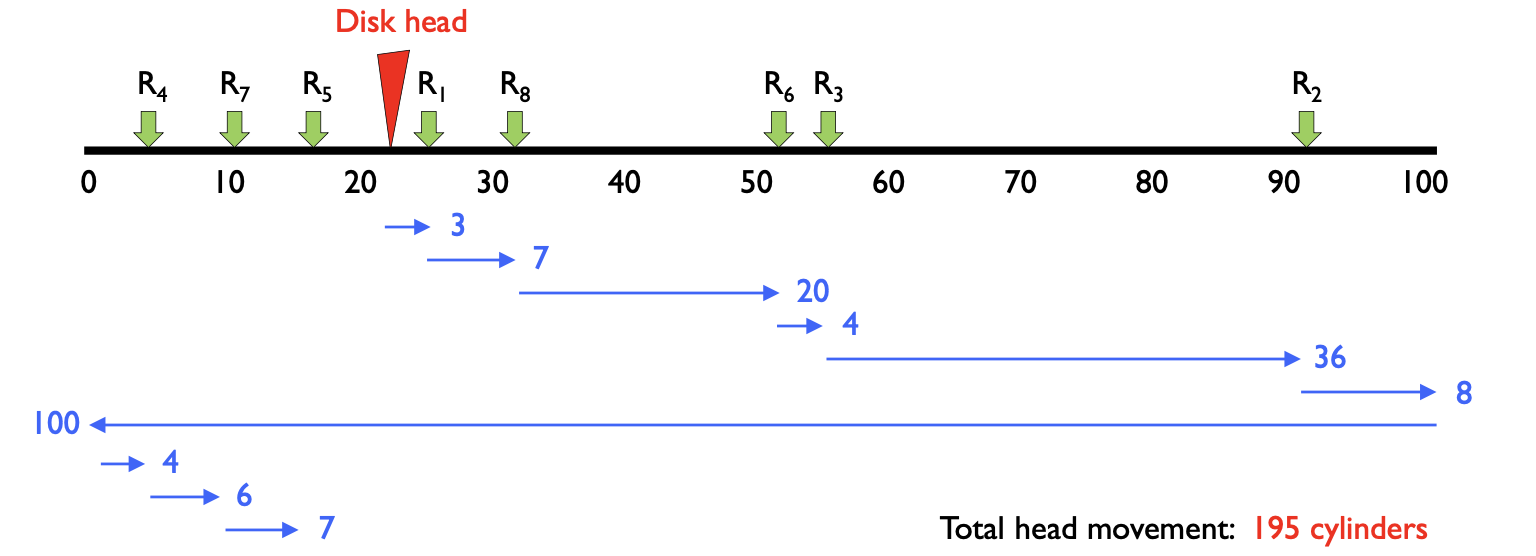 만약 처리 순서를 구하라고 하면, 수직선에 각 request 헤드 위치를 표시한 후, 문제에서 주어진 디스크 헤드 위치부터 그리디 알고리즘으로 풀면 된다.