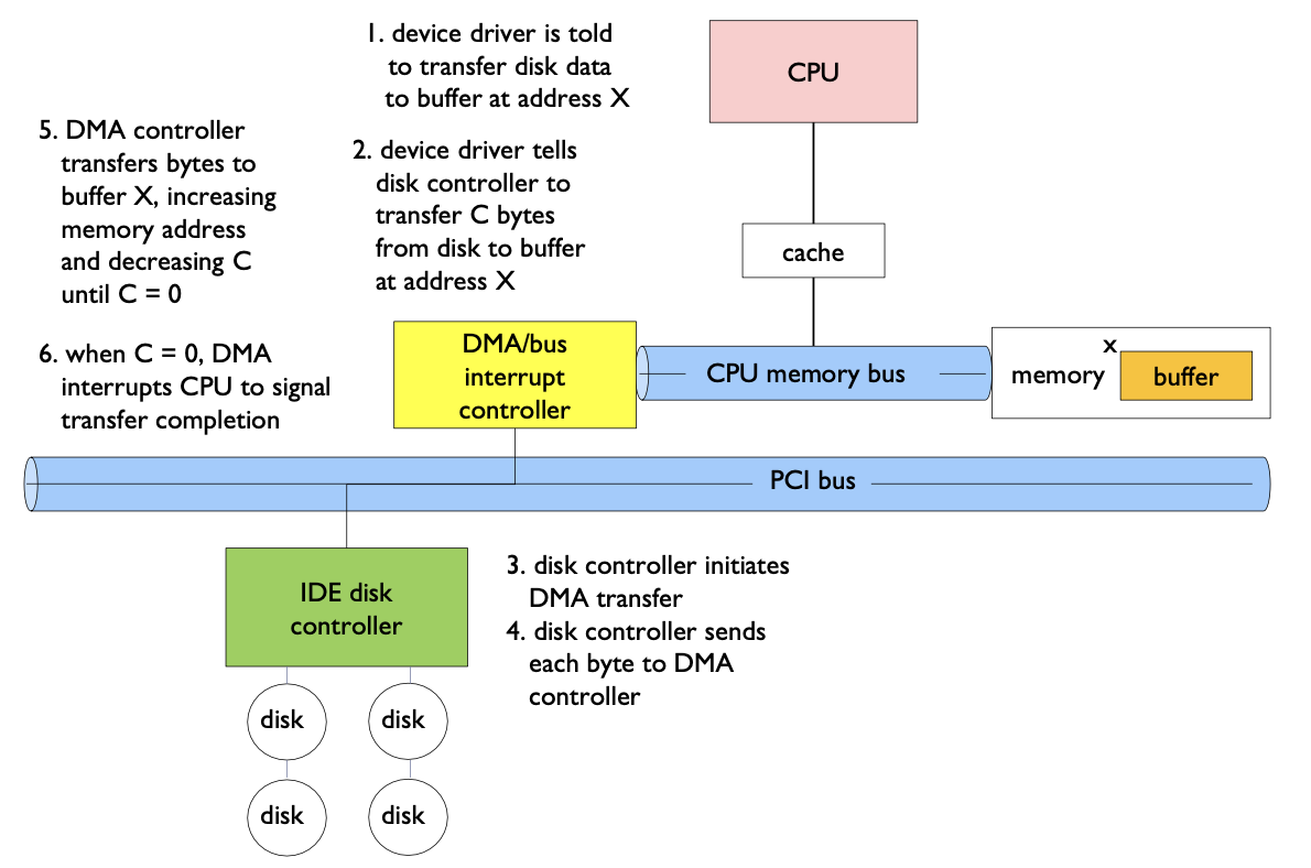 - 디바이스 드라이버는 버퍼 주소 X로 디스크 데이터를 전송하라는 명령을 받음