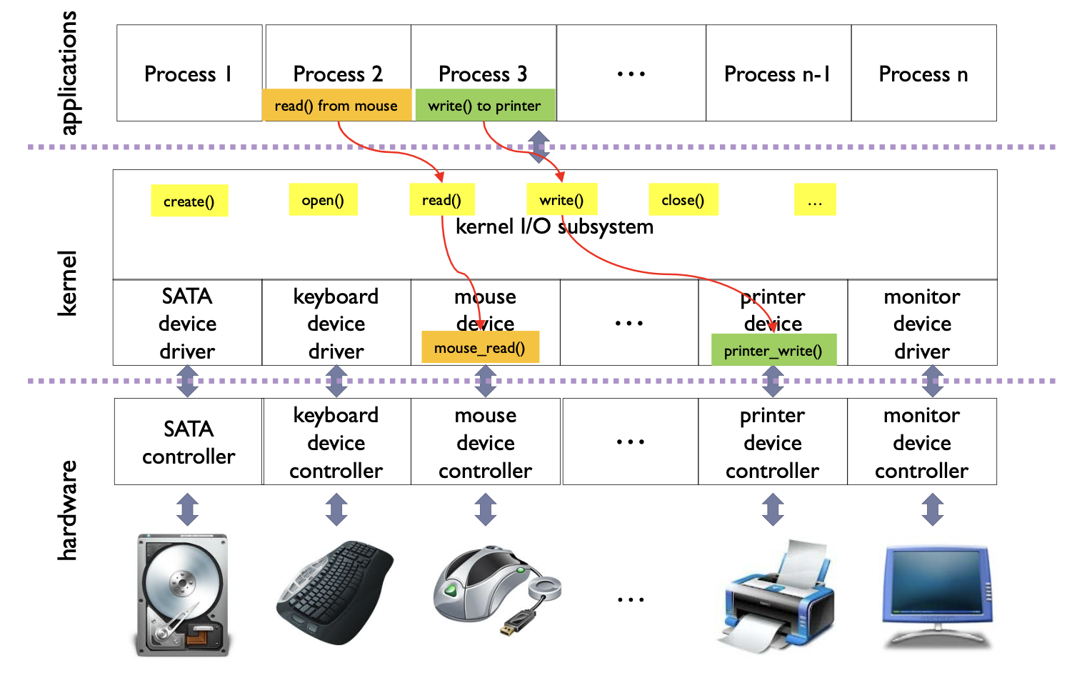 - I/O 서브시스템은 디바이스 드라이버와 협력할 프레임워크를 제공합니다.