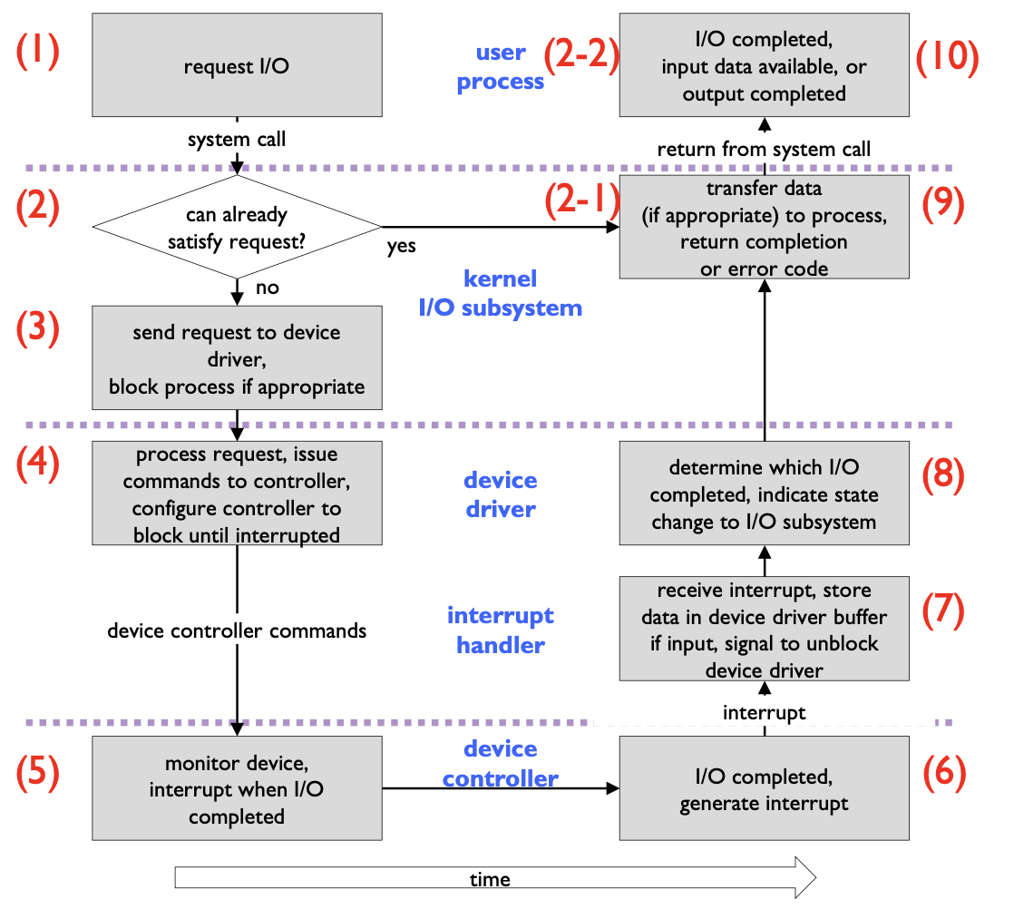 (9) 커널 I/O 서브시스템: (적절한 경우) 데이터를 프로세스에 전송하고, 완료 상태 또는 오류 코드를 반환