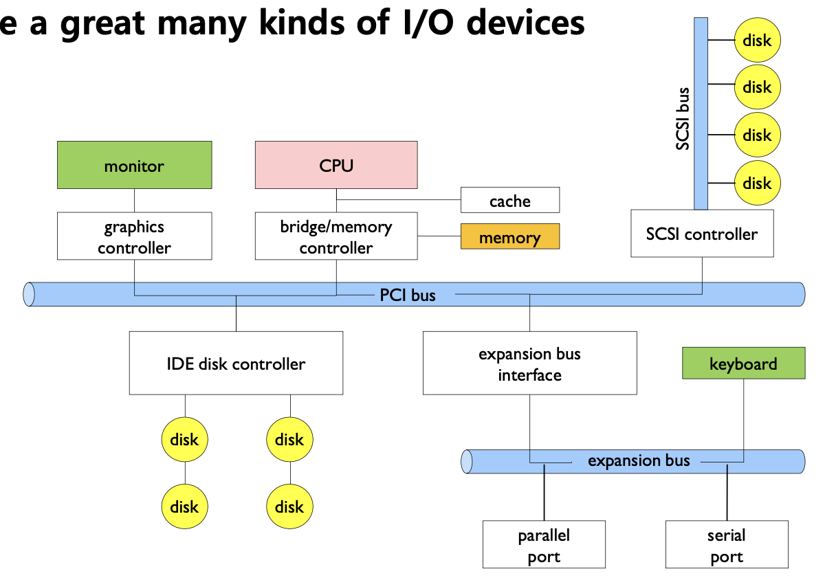 - CPU는 디바이스 컨트롤러(device controller)와 상호작용합니다.