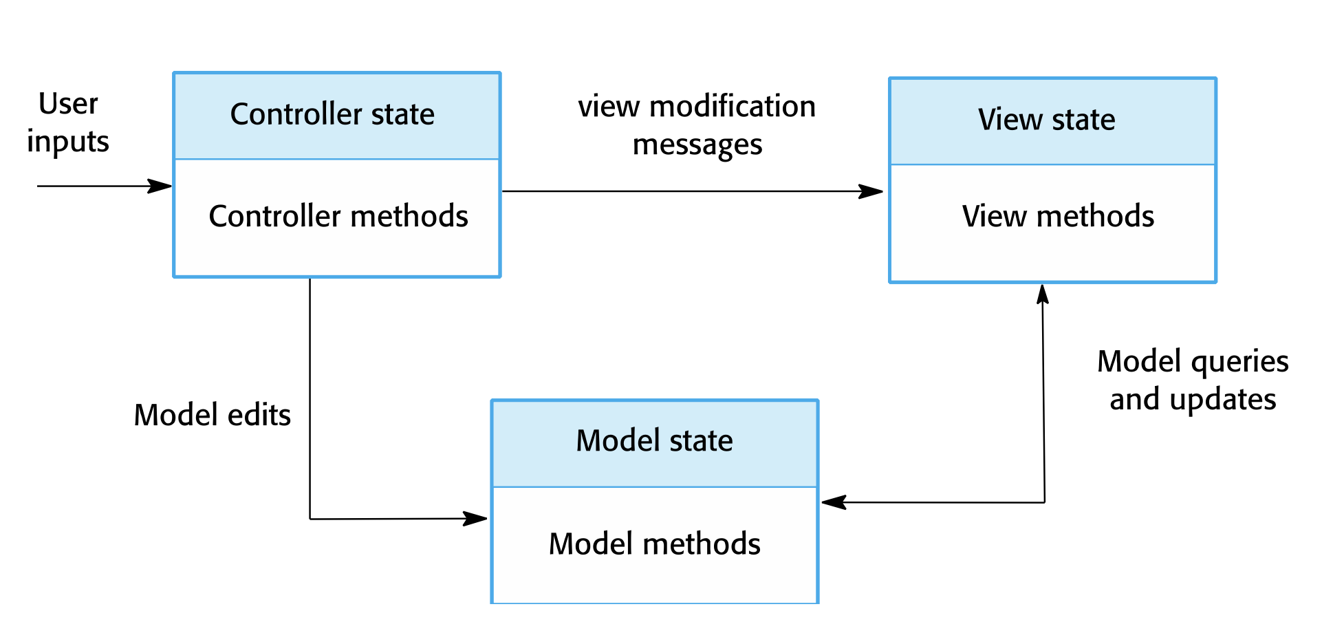 - 상호작용 모델은 Model-View-Controller 복합 패턴에 기반합니다 (Interaction model is based on the Model-View-Controller composite pattern).