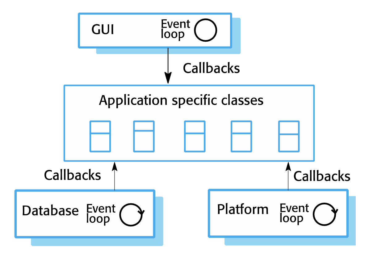- ex) 채팅 기능에서 메시지 업로드 call-back : 서버에서 메시지를 받고 모두에게 보낸 후, 송신자에게 잘 보냈다고 응답을 받는 구조 --> 프레임워크에서 어떻게 처리해야하는지에 대한 틀을 다 만들어 둠. 이런 서브 시스템들이 다 구현이 되어있다.