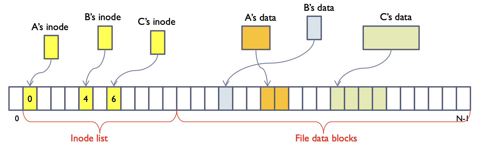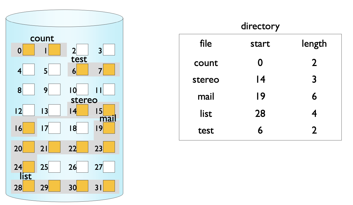 - 각 파일은 디스크의 연속된 블록 집합을 차지함