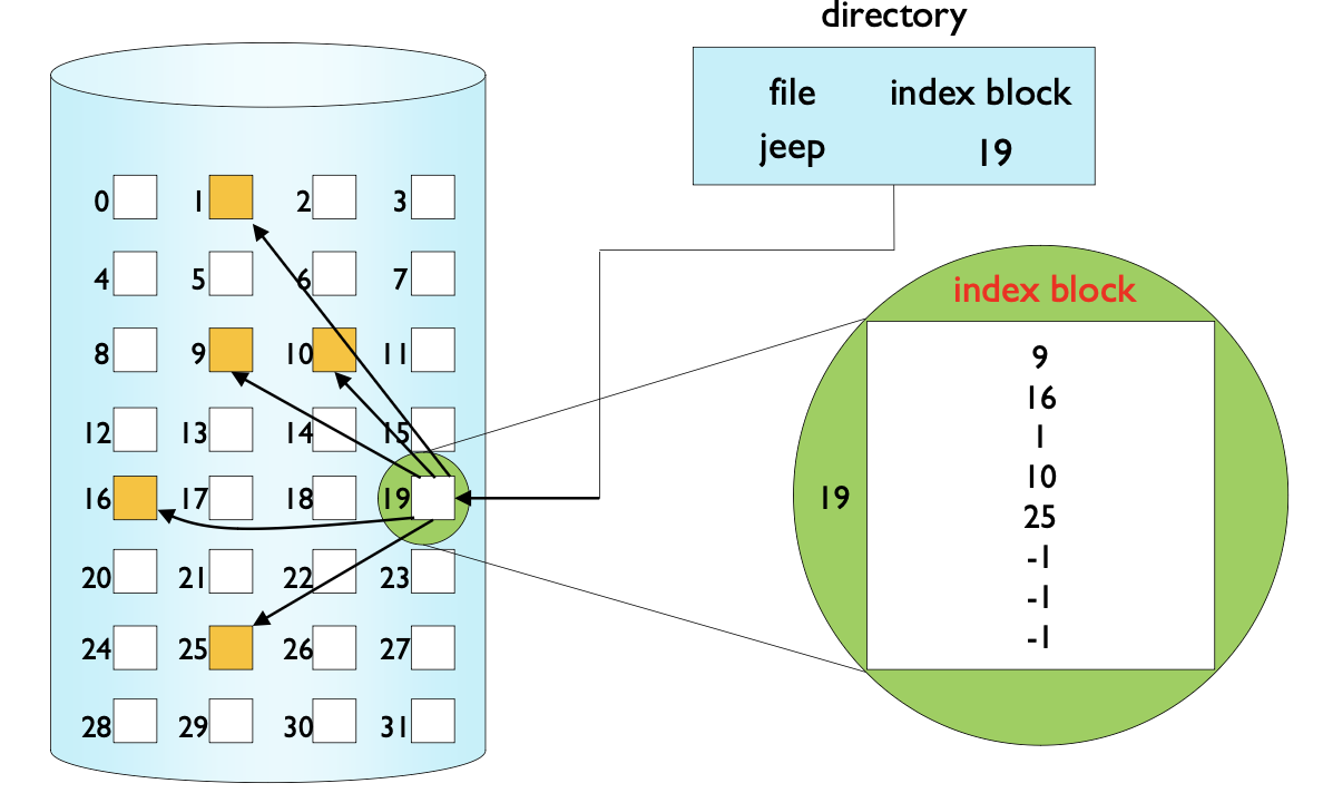 - 블록이 디스크 어디에나 흩어질 수 있음 → 공간 낭비 없음
