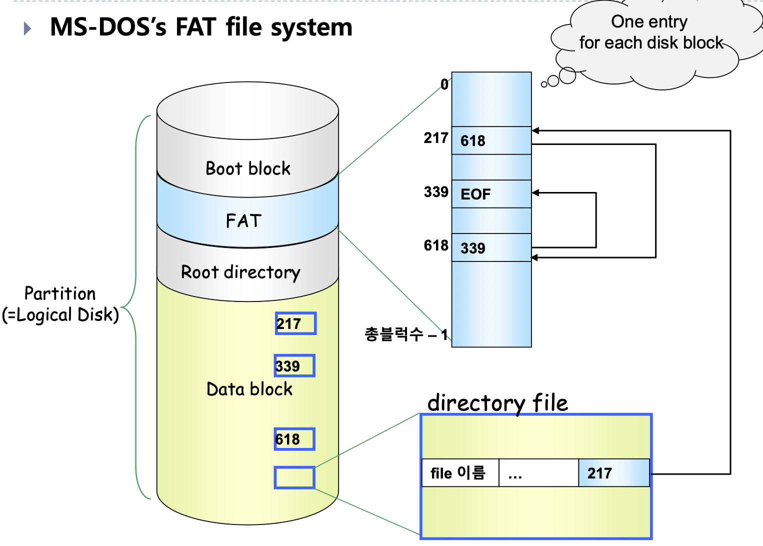- 예: MS-DOS 파일 시스템 (FAT 파일 시스템)