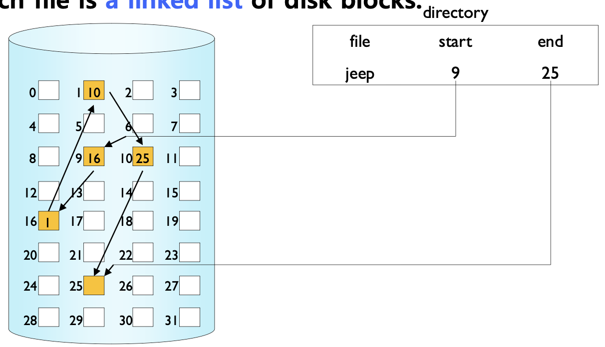 - 각 파일은 디스크 블록의 연결 리스트(linked list)