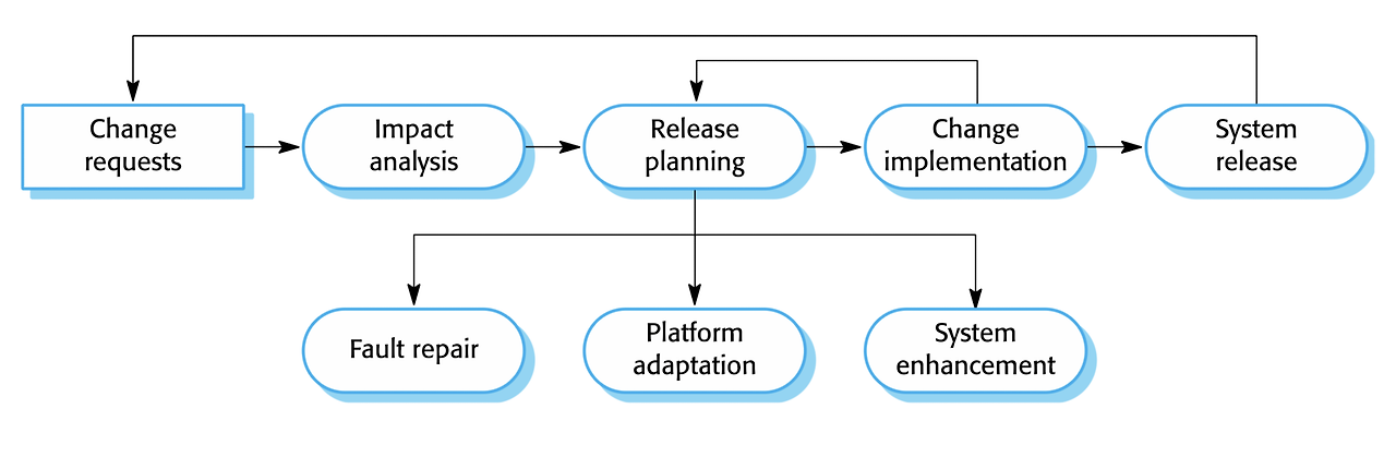 그래서 대부분 소프트웨어는 개발(development), 진화(evolution), 서비스(servicing), 퇴출(retirement) 과정을 거치게 된다