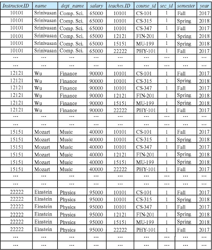 - 카테시안 곱 instructor × teaches는 모든 가능한 튜플 쌍을 생성