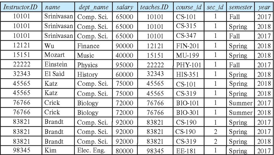 - instructor ID는 두 relation 모두에 나타나기 때문에, relation의 이름에 attribute을 첨부하여 이러한 attribute을 구별합니다.