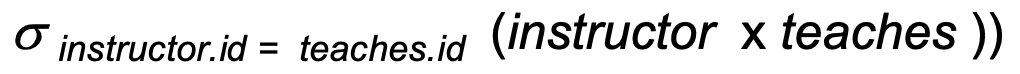 - "instructor × teaches" 중 교수와 그들이 가르치는 과목에 해당하는 튜플만 얻기 위해 위와 같이 사용한다.