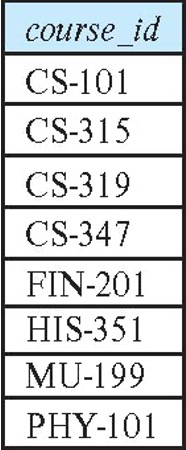 - 예: 2017년 가을 학기 또는 2018년 봄 학기 또는 두 학기 모두에 가르친 모든 과목 찾기
