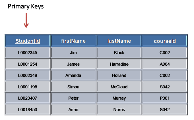 - 보통 PK는 관계형 DB Table에서 columns에 나타납니다