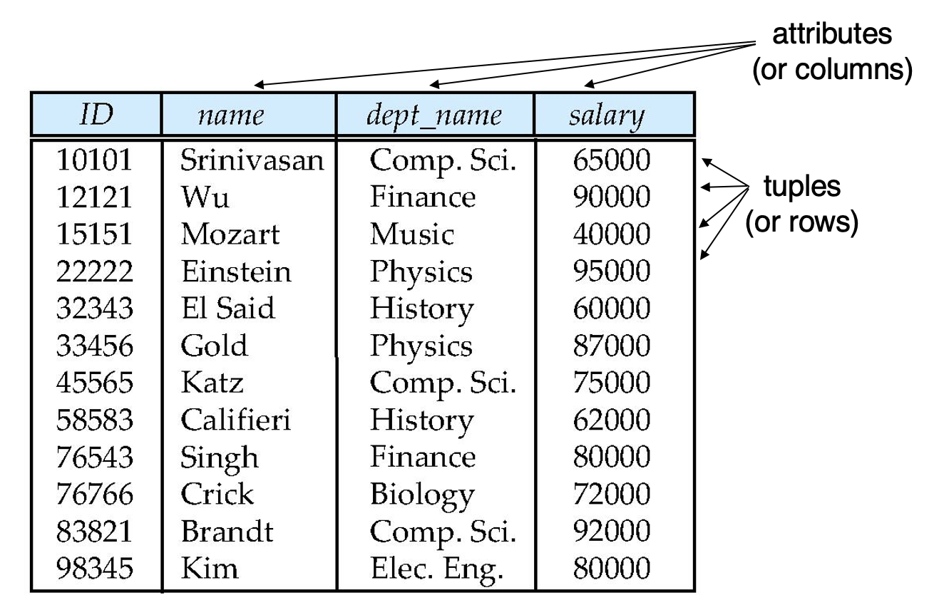 - 테이블은 행과 열로 구성되며, 행(rows)은 record를 나타내고 열(columns)은 attribute을 나타냅니다.