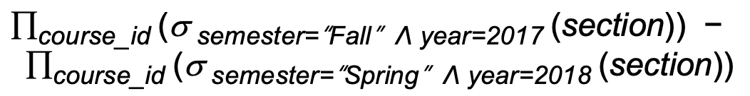 - 예: 2017년 가을 학기에는 가르쳤지만 2018년 봄 학기에는 가르치지 않은 모든 과목 찾기