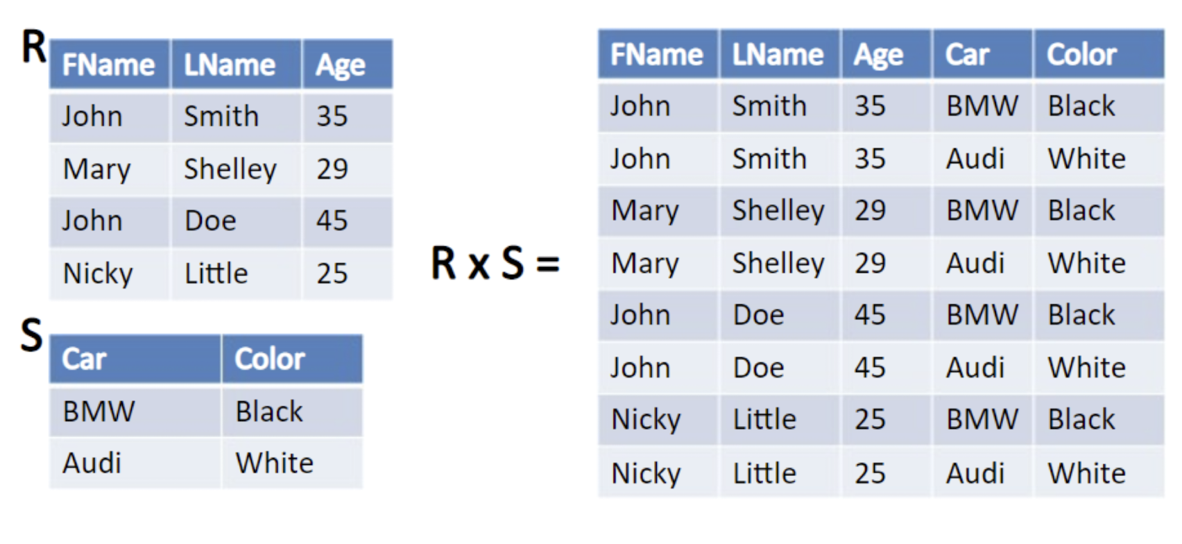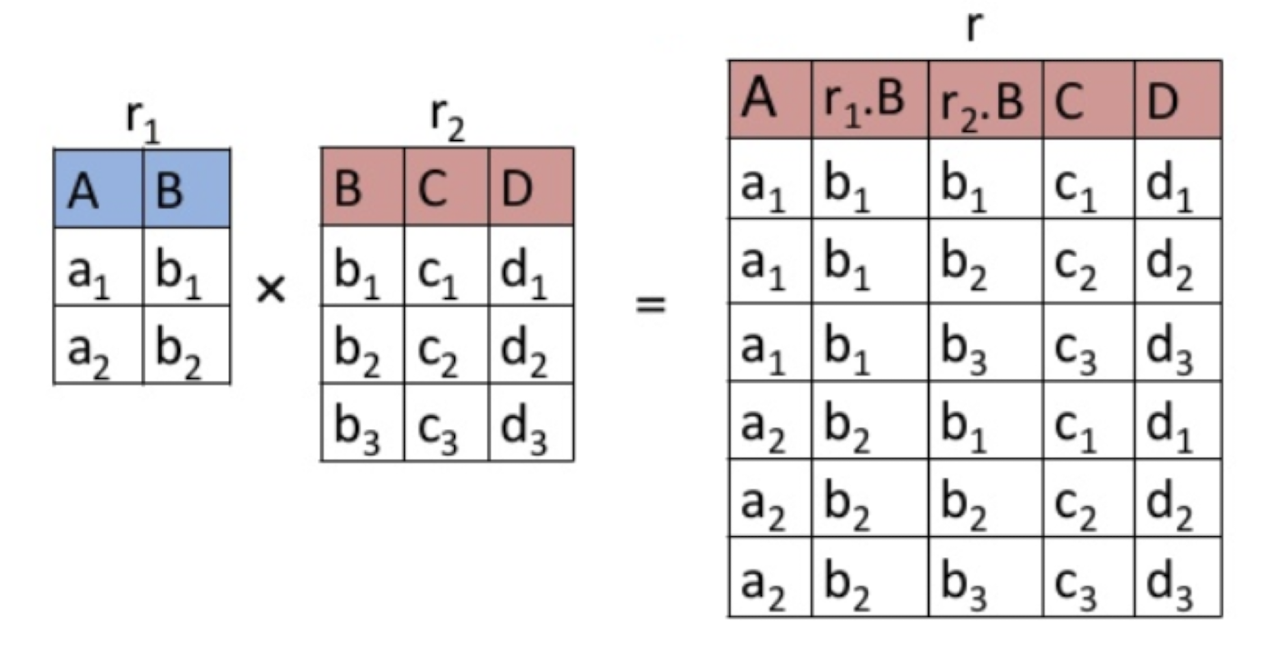 - 관계 대수의 카테시안 곱 연산(Cartesian product operation)에 해당합니다.
